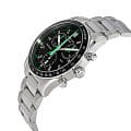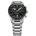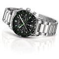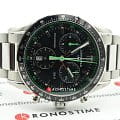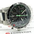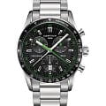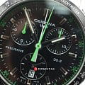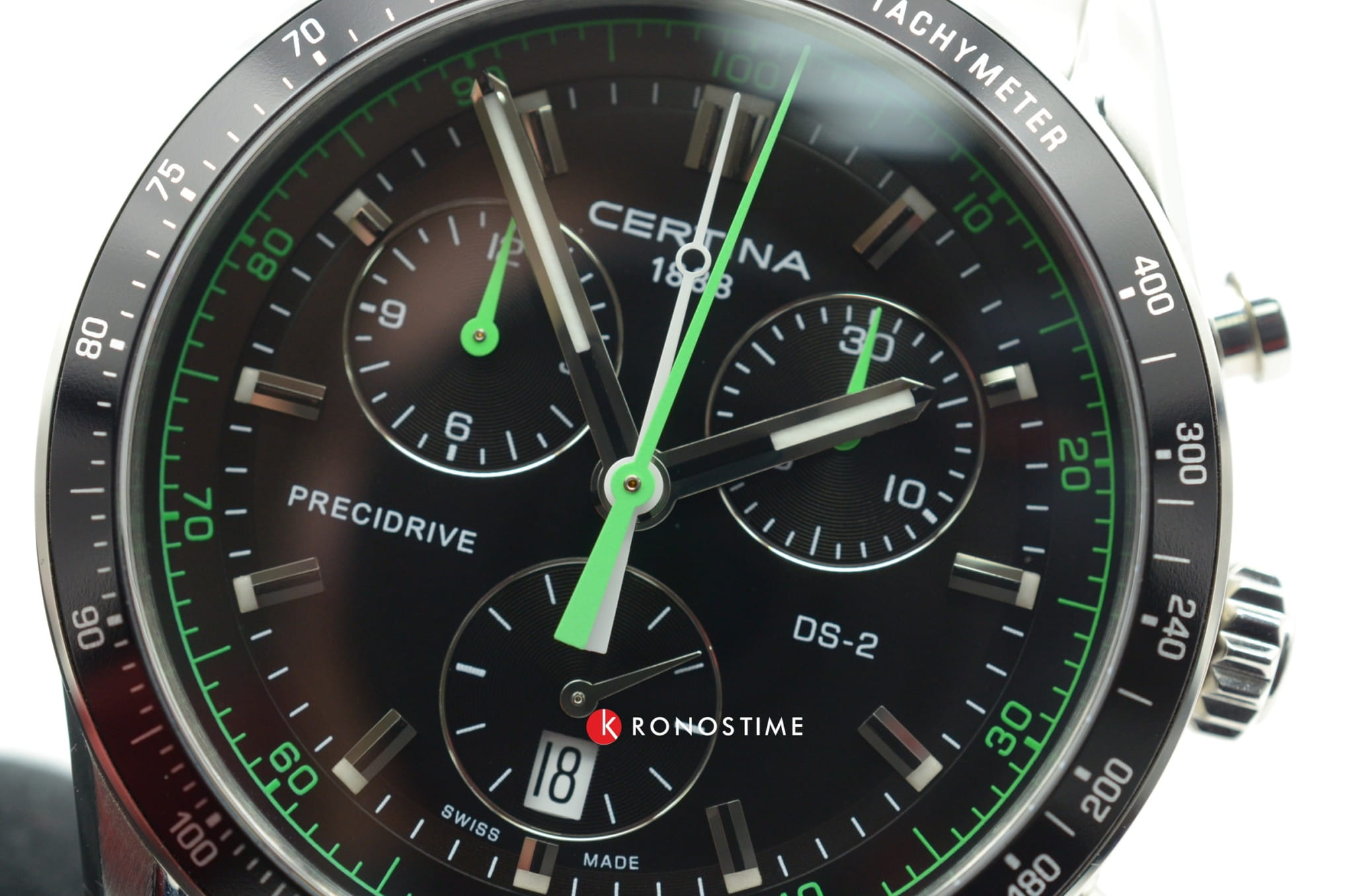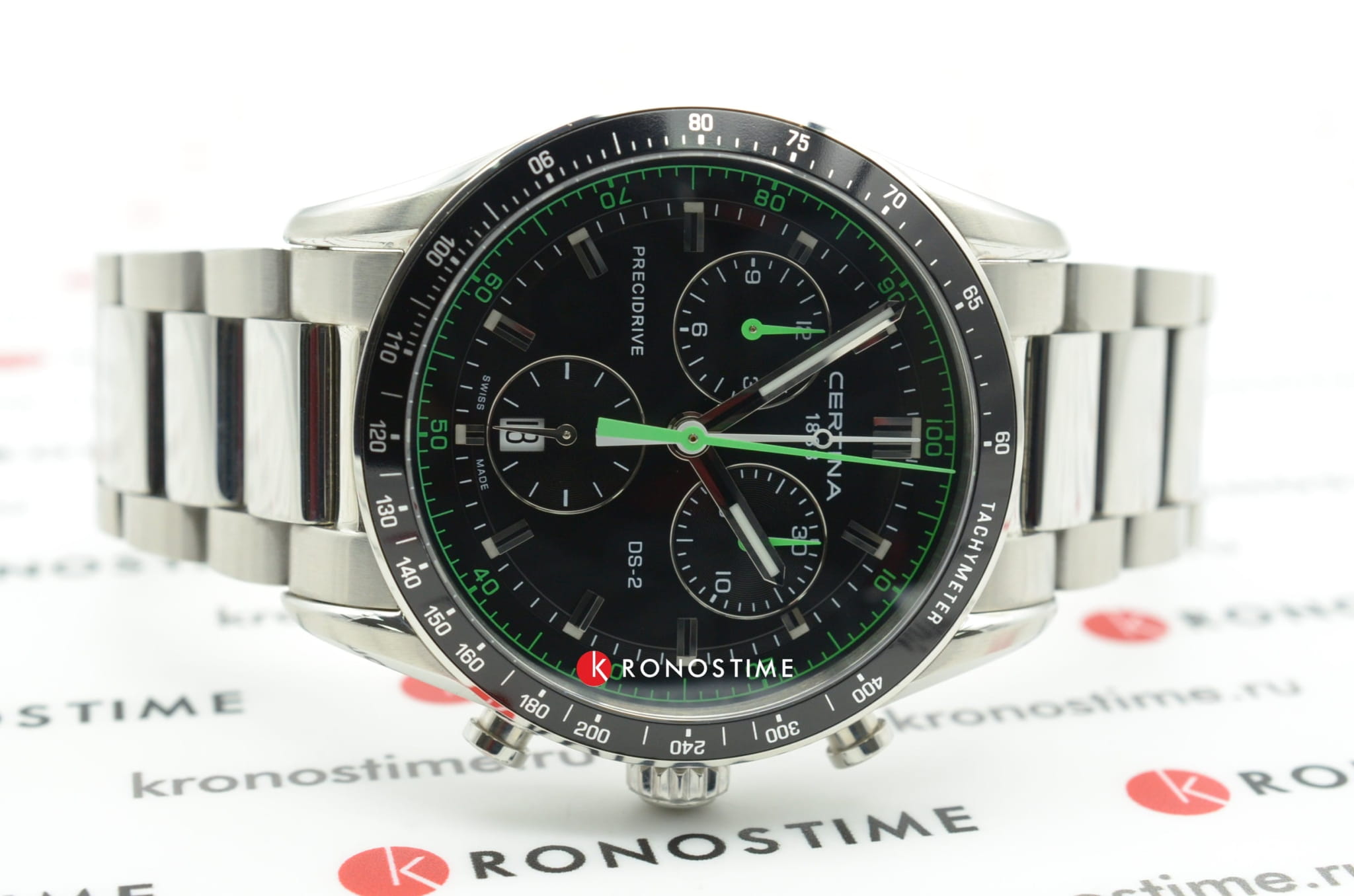 Брендовый аксессуар сразу притягивает внимание. Чёрный циферблат, дополненный зелёными элементами и функциональными окошками, отражает спортивную динамичность. Алюминиевый безельБезельВнешний ободок, закрепляющий стекло. В спортивных часах так называется поворотное кольцо с делениями на циферблате, выполняет роль таймера – замеряет отрезки времени на шкале. Неподвижный безель – элемент декора. Однонаправленно вращающийся безель на дайверских часах позволяет фиксировать моменты погружения и выныривания на поверхность. размечен шкалой тахиметраТахиметрРазмеченная шкала, располагается на ободке или безеле часов. Тахиметр позволяет рассчитать скорость на определённом участке пути, расстояние измеряется в километрах или милях.. Часы основаны на концепции Double SecurityDS ConceptDouble Security Concept, обозначает двойную надёжность и безупречную точность часов Certina. Двойная система защиты подразумевает обеспечение максимальной устойчивости к ударам и высоких показателей водонепроницаемости., что свидетельствует о высокой устойчивости к ударам и водонепроницаемости (до 10 бар) модели. Швейцарский кварцевый калибр ETA 251.264 Precidrive™Precidrive™Инновационный кварцевый механизм Certina. Часы, оснащённые этим швейцарским калибром, приравниваются к точности к сертифицированным хронометрам, точность хода составляет +/-10 секунд в год., измеряющий время с точностьюдо одной сотой секунды. Двухстороннее антибликовое покрытие для стекла из сапфира. Корпус и браслет из стали 316L с антикоррозионными свойствами. Задняя крышка с фирменной гравировкой. ХронографХронографФункция позволяет измерять отрезки времени с особой точностью: часы, минуты, секунды. Верным признаком хронографа является наличие на циферблате 3 дополнительных окошек-счётчиков., календарь, индикатор EOLEOLПредставляет собой систему, уведомляющую владельца часов о необходимости замены элемента питания. За 2 недели до полного разряда батарейки секундная стрелка перестаёт ходить чётко и начинает перепрыгивать на 3-4 деления., секундомер. Диаметр корпуса: 41 мм.