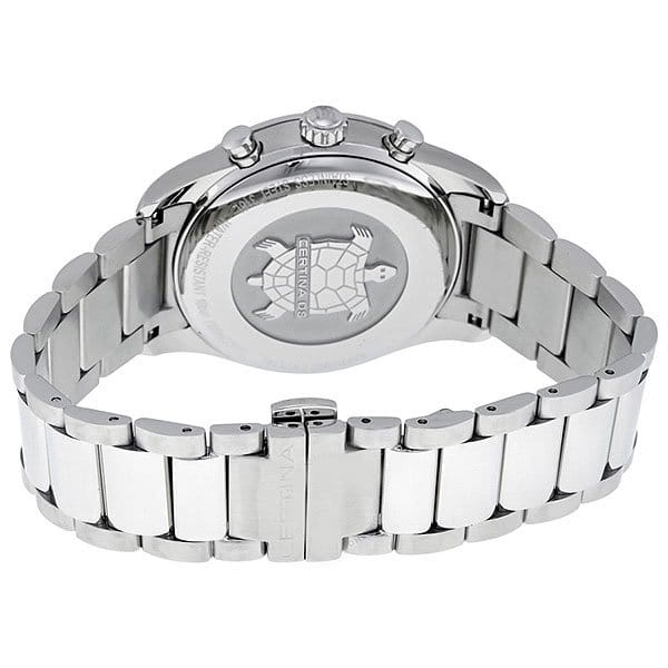 Брендовый аксессуар сразу притягивает внимание. Чёрный циферблат, дополненный контрастными элементами и функциональными окошками, отражает спортивную динамичность. Алюминиевый безельБезельВнешний ободок, закрепляющий стекло. В спортивных часах так называется поворотное кольцо с делениями на циферблате, выполняет роль таймера – замеряет отрезки времени на шкале. Неподвижный безель – элемент декора. Однонаправленно вращающийся безель на дайверских часах позволяет фиксировать моменты погружения и выныривания на поверхность. размечен шкалой тахиметраТахиметрРазмеченная шкала, располагается на ободке или безеле часов. Тахиметр позволяет рассчитать скорость на определённом участке пути, расстояние измеряется в километрах или милях.. Часы основаны на концепции Double SecurityDS ConceptDouble Security Concept, обозначает двойную надёжность и безупречную точность часов Certina. Двойная система защиты подразумевает обеспечение максимальной устойчивости к ударам и высоких показателей водонепроницаемости., что свидетельствует о высокой устойчивости к ударам и водонепроницаемости (до 10 бар) модели. Швейцарский кварцевый калибр ETA 251.264 Precidrive™Precidrive™Инновационный кварцевый механизм Certina. Часы, оснащённые этим швейцарским калибром, приравниваются к точности к сертифицированным хронометрам, точность хода составляет +/-10 секунд в год., измеряющий время с точностью до одной сотой секунды. Двухстороннее антибликовое покрытие для стекла из сапфира. Корпус и браслет из стали 316L с антикоррозионными свойствами. Задняя крышка с фирменной гравировкой. ХронографХронографФункция позволяет измерять отрезки времени с особой точностью: часы, минуты, секунды. Верным признаком хронографа является наличие на циферблате 3 дополнительных окошек-счётчиков., календарь, индикатор EOLEOLПредставляет собой систему, уведомляющую владельца часов о необходимости замены элемента питания. За 2 недели до полного разряда батарейки секундная стрелка перестаёт ходить чётко и начинает перепрыгивать на 3-4 деления., секундомер. Диаметр корпуса: 41 мм.