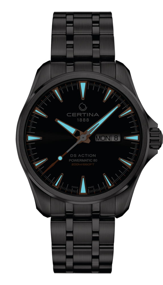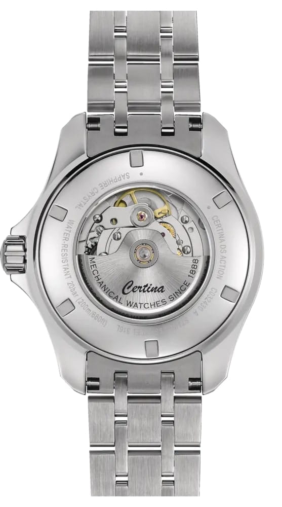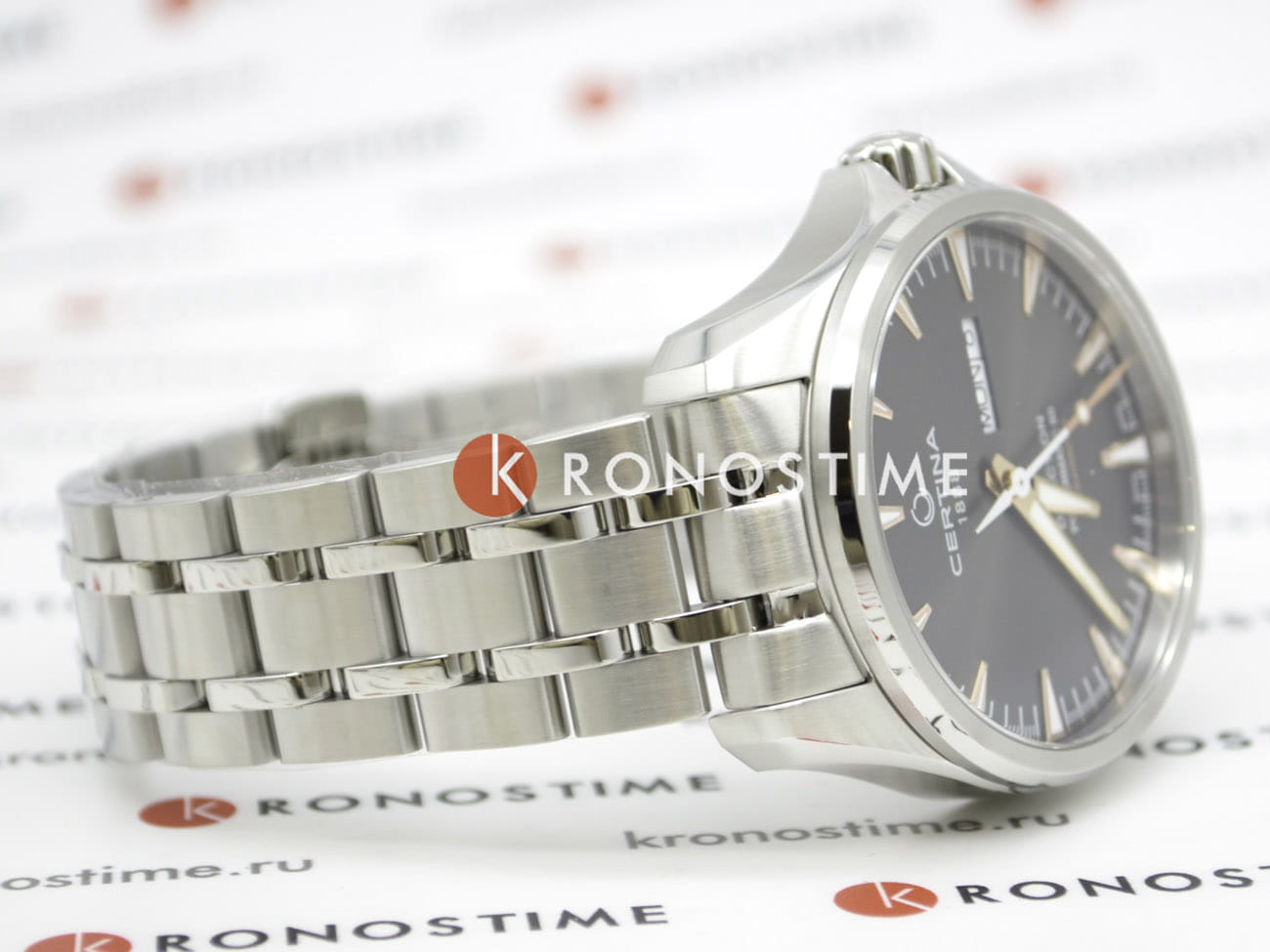 Брендовая модель имеет антрацитовый циферблат с контрастными стрелками и часовой разметкой, что обеспечивает хорошую читаемость показателей в любых условиях. Стальной браслет надёжно обхватывает запястье, а застёжка «бабочка» с кнопкамиЗастёжка "бабочка"Такой вид застёжки дополняется предохранителями, помогающими избежать случайного раскрытия браслета. Обладают изящным исполнением. предотвращает случайное расстёгивание. Часы работают за счёт швейцарского пружинного механизма ETA Powermatic 80Powermatic 80Эксклюзивный калибр от швейцарской компании ETA с увеличенным запасом хода до 80 часов за счёт удлинённой заводной пружины. Характеризуется улучшенной системой спуска со сниженным трением., его запас хода увеличен до 80 часов. Соблюдение DS ConceptDS ConceptDouble Security Concept, обозначает двойную надёжность и безупречную точность часов Certina. Двойная система защиты подразумевает обеспечение максимальной устойчивости к ударам и высоких показателей водонепроницаемости.. Корпус из нержавеющей стали 316L. Сапфировое стеклоСапфировое стеклоПрочный и надёжный материал из кристалла сапфира синтетического происхождения, характеризующийся особой твёрдостью и устойчивостью к царапинам и повреждениям. с покрытием «антиблик». Водостойкость 200 метров. Люминисцентное покрытиеЛюминесцентное покрытиеПозволяет считывать показания времени в темноте. Производители наносят на стрелки, часовые индексы, безель или поверхность циферблата светонакопительный состав, дающий холодное свечение. SuperLumiNova. Завинчивающаяся задняя крышка. Защищённая заводная головка. Календарь с индикацией числа и дня недели. Диаметр корпуса: 41 мм.