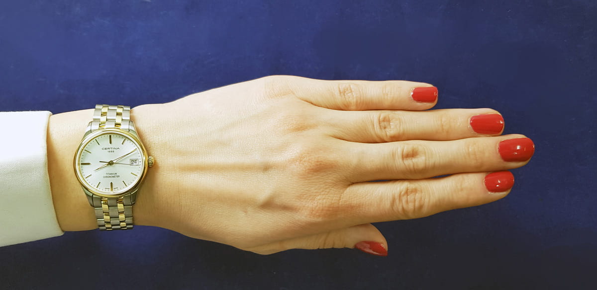 Женские швейцарские наручные часы с сапфировым стекломСапфировое стеклоПрочный и надёжный материал из кристалла сапфира синтетического происхождения, характеризующийся особой твёрдостью и устойчивостью к царапинам и повреждениям. Certina DS-8 Lady 30mm C033.251.55.031.00, кварцевый механизм с высокой точностью. Сапфировое стеклоСапфировое стеклоПрочный и надёжный материал из кристалла сапфира синтетического происхождения, характеризующийся особой твёрдостью и устойчивостью к царапинам и повреждениям. устойчивое к появлению царапин, обладающее высокой прозрачностью. Класс водозащиты: 100 метров, позволит плавать, нырять и заниматься другими водными видами спорта. Корпус и браслет часов изготовлены из титана с частичным PVDPVDУльтратонкое покрытие наносится в технике вакуумного напыления, сочетает в себе нитрид титана особой прочности со слоем золота или оксида хрома. Несёт в себе декоративную или защитную функцию. цвета желтое золото . Браслет с застёжкой-бабочкой с кнопкамиЗастёжка "бабочка"Такой вид застёжки дополняется предохранителями, помогающими избежать случайного раскрытия браслета. Обладают изящным исполнением. . Окошко даты находятся в положении 3 часа.