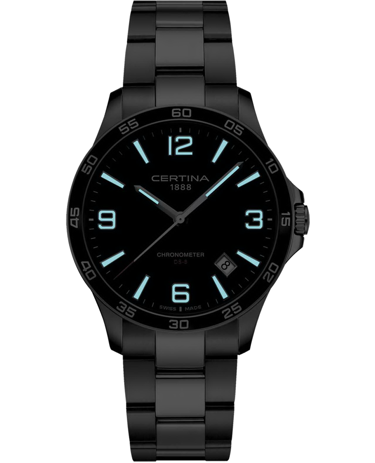 Дизайн аксессуара с чёрным циферблатом тщательно продуман, спортивное оформление перекликается с элементами лаконичной классики. Благодаря крупной индикации времени обеспечивается превосходная читаемость циферблата даже при мимолётном взгляде на запястье. Наручные часы отображают время с хронометрической точностью. Швейцарский кварцевый калибр ETA F07.412 Precidrive™Precidrive™Инновационный кварцевый механизм Certina. Часы, оснащённые этим швейцарским калибром, приравниваются к точности к сертифицированным хронометрам, точность хода составляет +/-10 секунд в год.. Ударопрочный корпусУдаропрочный корпусМеханизм заключён в корпус, выполненный из современных материалов, устойчивых к ударам, механическим повреждениям и падению с высоты: инновационный пластик, карбон, нержавеющая сталь, титан. и браслет из нержавеющей стали 316L. Заводная головка с системой защиты. Водостойкость 10 бар. Апертура даты. Индикатор EOLEOLПредставляет собой систему, уведомляющую владельца часов о необходимости замены элемента питания. За 2 недели до полного разряда батарейки секундная стрелка перестаёт ходить чётко и начинает перепрыгивать на 3-4 деления.. Диаметр корпуса: 41.5 мм.