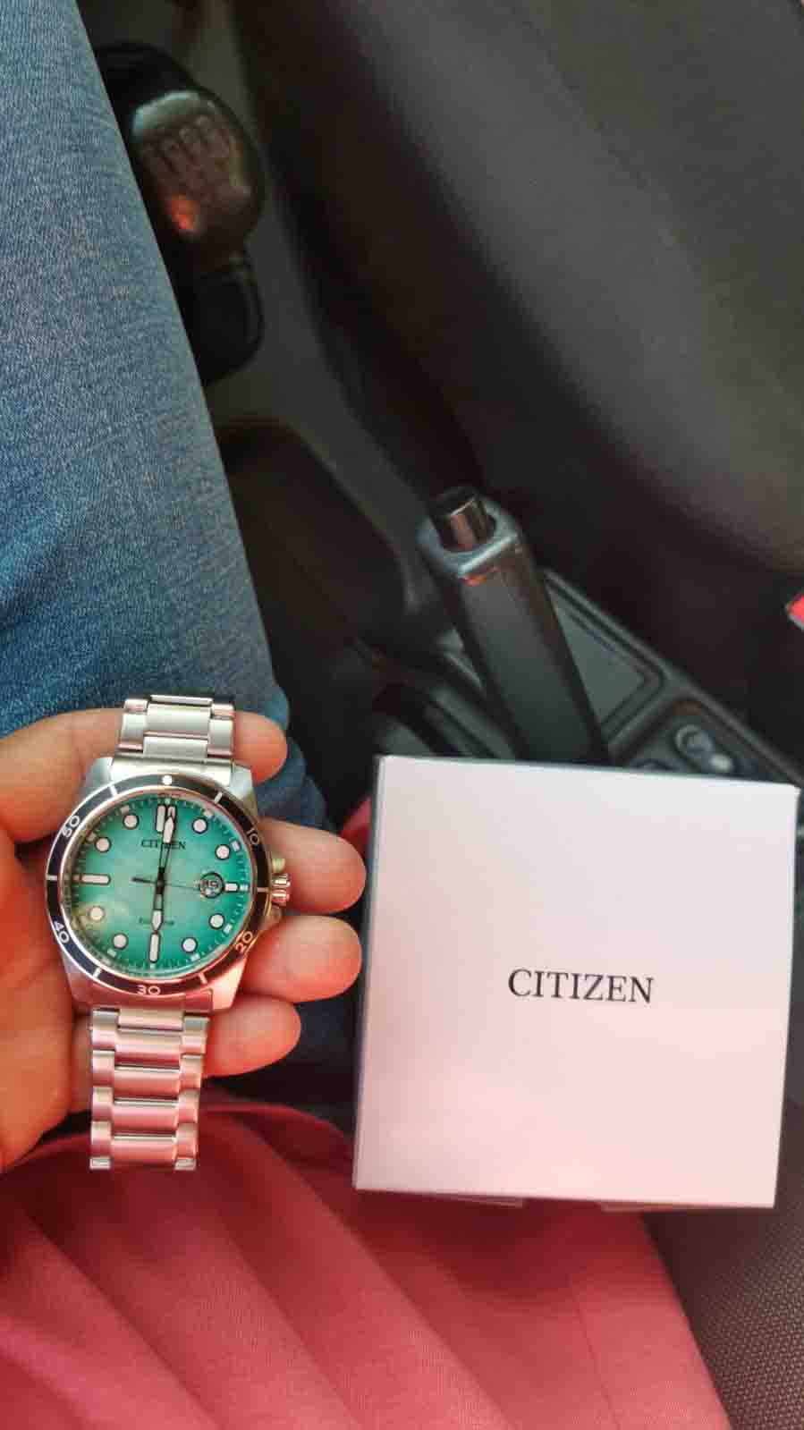 Citizen AW1816-89L — это стильные и практичные часы японского производства, которые станут отличным повседневным аксессуаром для активных мужчин. Модель оснащена современным кварцевым механизмом Citizen J810 и инновационной системой Eco-Drive, работающей на солнечной энергии, благодаря чему часы не требуют замены батарейки, а запас хода достигает 240 дней. Корпус диаметром 41,5 мм и толщиной 11,8 мм выполнен из прочной нержавеющей стали, а на безельБезельВнешний ободок, закрепляющий стекло. В спортивных часах так называется поворотное кольцо с делениями на циферблате, выполняет роль таймера – замеряет отрезки времени на шкале. Неподвижный безель – элемент декора. Однонаправленно вращающийся безель на дайверских часах позволяет фиксировать моменты погружения и выныривания на поверхность. нанесено черное IP-покрытиеIP-покрытиеМетод ионного напыления. Демонстрирует повышенную устойчивость к истиранию, окислению и химическим веществам. Под воздействием высокого давления и температуры около 1500°C молекулы металла надёжно соединяются с частицами корпуса часов., что обеспечивает надежность и долговечность. Бирюзовый циферблат украшен метками в виде точек и штрихов, а стрелки и метки с люминесцентным покрытиемЛюминесцентное покрытиеПозволяет считывать показания времени в темноте. Производители наносят на стрелки, часовые индексы, безель или поверхность циферблата светонакопительный состав, дающий холодное свечение. гарантируют отличную видимость времени даже в темноте. Окошко даты с увеличительным стеклом расположено в положении 3 часа, а заводная головка с защитой и завинчивающаяся задняя крышка повышают уровень безопасности и герметичности. Часы оснащены функцией индикации заряда EOLEOLПредставляет собой систему, уведомляющую владельца часов о необходимости замены элемента питания. За 2 недели до полного разряда батарейки секундная стрелка перестаёт ходить чётко и начинает перепрыгивать на 3-4 деления. и системой предотвращения перезарядки для дополнительного удобства. Минеральное стеклоМинеральное стеклоМинеральное стекло представляет собой искусственно выращенный минерал кварца. Такое стекло отличается особой устойчивостью к повреждениям и царапинам. Уступает по некоторым качествам сапфировому стеклу. эффективно защищает циферблат от царапин. Водозащита 100WR позволяет носить часы во время плавания и занятий водными видами спорта. Стальной браслет с раскладной застёжкойРаскладная застёжкаТакой тип застёжки используется только на браслетах из металла. Она никогда не раскрывается полностью, происходит разделение на 2 и более частей. Раскладывающая застёжка снизит вероятность потери часов к минимуму. обеспечивает комфорт и надежную фиксацию на руке, а вес модели составляет 138 грамм, что делает часы удобными для ежедневного ношения.