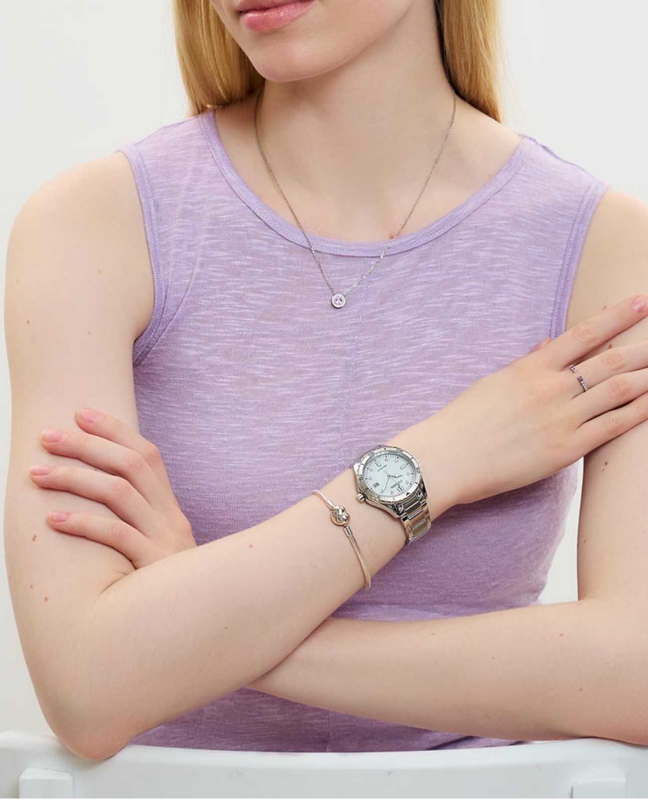 Элегантные женские часы Citizen FE6170-88D станут ярким акцентом любого образа благодаря современному дизайну и высокому качеству исполнения. Корпус диаметром 36,8 мм и толщиной 9,8 мм выполнен из прочной нержавеющей стали, что гарантирует долговечность и надежность. Особое внимание привлекает перламутровый циферблат, украшенный сверкающими кристаллами в виде часовых меток, что придаёт модели утончённый и изысканный вид. Кварцевый механизм с калибром Citizen J810 работает на инновационной системе Eco-Drive — часы заряжаются от любого источника света, обеспечивая запас хода до 240 дней и не требуя замены батарейки. Функции индикации заряда EOLEOLПредставляет собой систему, уведомляющую владельца часов о необходимости замены элемента питания. За 2 недели до полного разряда батарейки секундная стрелка перестаёт ходить чётко и начинает перепрыгивать на 3-4 деления.  и предотвращения перезарядки обеспечивают дополнительное удобство в использовании. Окошко даты расположено на отметке 3 часа для быстрого просмотра текущего числа. Прочное минеральное стеклоМинеральное стеклоМинеральное стекло представляет собой искусственно выращенный минерал кварца. Такое стекло отличается особой устойчивостью к повреждениям и царапинам. Уступает по некоторым качествам сапфировому стеклу. защищает циферблат от случайных царапин, а водозащита уровня 100WR позволяет использовать часы даже во время плавания. А безельБезельВнешний ободок, закрепляющий стекло. В спортивных часах так называется поворотное кольцо с делениями на циферблате, выполняет роль таймера – замеряет отрезки времени на шкале. Неподвижный безель – элемент декора. Однонаправленно вращающийся безель на дайверских часах позволяет фиксировать моменты погружения и выныривания на поверхность. часов с частичным IP-покрытиемIP-покрытиеМетод ионного напыления. Демонстрирует повышенную устойчивость к истиранию, окислению и химическим веществам. Под воздействием высокого давления и температуры около 1500°C молекулы металла надёжно соединяются с частицами корпуса часов. вращается в одном направлении. Стрелки с люминесцентным покрытиемЛюминесцентное покрытиеПозволяет считывать показания времени в темноте. Производители наносят на стрелки, часовые индексы, безель или поверхность циферблата светонакопительный состав, дающий холодное свечение. обеспечивают отличную читаемость времени даже в темное время суток. Стальной браслет с раскладной застёжкойРаскладная застёжкаТакой тип застёжки используется только на браслетах из металла. Она никогда не раскрывается полностью, происходит разделение на 2 и более частей. Раскладывающая застёжка снизит вероятность потери часов к минимуму. обеспечивает комфортное и надежное крепление на запястье. Модель произведена в Японии и отличается высоким стандартом качества.
