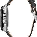 Citizen Promaster JY8149-05E часы-хронографХронографФункция позволяет измерять отрезки времени с особой точностью: часы, минуты, секунды. Верным признаком хронографа является наличие на циферблате 3 дополнительных окошек-счётчиков. с секундомеромСекундомерСекундоме́р — прибор, способный измерять интервалы времени с точностью до долей секунды. спортивного дизайна с высоким уровнем водозащиты. Корпус из нержавеющей стали диаметром 45,7 мм идеально сбалансирован. Сапфировое стеклоСапфировое стеклоПрочный и надёжный материал из кристалла сапфира синтетического происхождения, характеризующийся особой твёрдостью и устойчивостью к царапинам и повреждениям. с антибликовым покрытием обеспечивает отличную защиту циферблата от царапин. Часы работают на основе кварцевого механизма, питание от солнечной энергии. Кожаный ремешок на стандартной застёжке идеально дополняют дизайн часов, обеспечивая комфортное ношение. Стрелки и метки на циферблате имеют люминесцентное покрытиеЛюминесцентное покрытиеПозволяет считывать показания времени в темноте. Производители наносят на стрелки, часовые индексы, безель или поверхность циферблата светонакопительный состав, дающий холодное свечение. позволяющее легко определять время даже в темноте. Поворотный безельБезельВнешний ободок, закрепляющий стекло. В спортивных часах так называется поворотное кольцо с делениями на циферблате, выполняет роль таймера – замеряет отрезки времени на шкале. Неподвижный безель – элемент декора. Однонаправленно вращающийся безель на дайверских часах позволяет фиксировать моменты погружения и выныривания на поверхность. с частичным IP-покрытиемIP-покрытиеМетод ионного напыления. Демонстрирует повышенную устойчивость к истиранию, окислению и химическим веществам. Под воздействием высокого давления и температуры около 1500°C молекулы металла надёжно соединяются с частицами корпуса часов.. Автоматический прием сигналов от радиовышек, расположенных в различных точках земного шара, которые передают временные сигналы от определенных атомных часов. Коррекция текущего времени радиосигналом на территории почти всей Европы, США, Японии и Китая. Функция индикации заряда (EOL) и предотвращения перезарядки. Мировое времяМировое время Полезное часовое усложнение, отображающее время в основных городах и известных областях по всему миру, оно связано с часовыми поясами, удобно для путешественников и бизнесменов. - 43 города, переход на зимнее и летнее время. Всемирное координированное время UTCUTCВсемирное кординационное время, не имеющее привязки к географическому положению Гринвича, основывается на атомном отсчёте времени. Регулировка времени осуществляется более точно, чем устаревшее GMT.