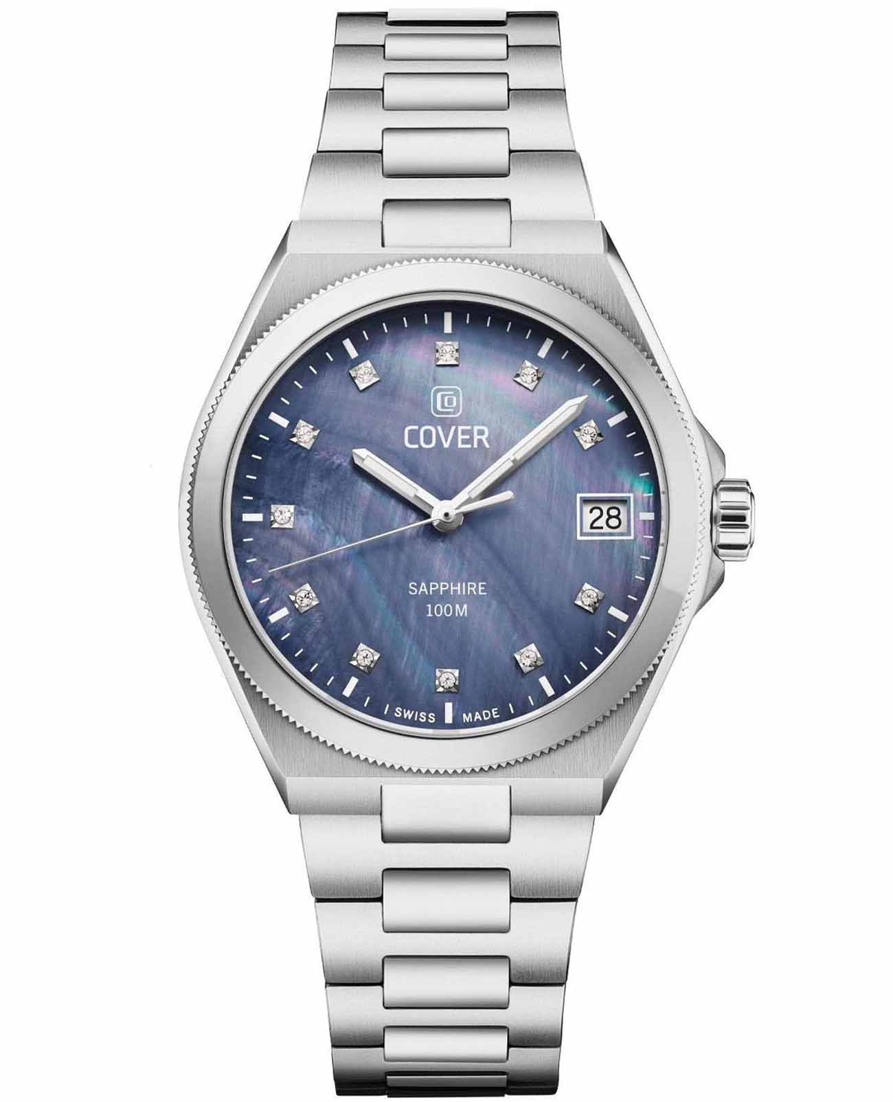 Часы Cover Iconosteel Lady CO223.02 воплощают в себе вечную элегантность благодаря своему чистому и утонченному дизайну. Эти швейцарские часы изготовлен из полированной нержавеющей стали, включая корпус и браслет. Они выделяются светящимся синим циферблатом из перламутра, обрамленным характерной формой Iconosteel с круглым корпусом и рифлёным безелемБезельВнешний ободок, закрепляющий стекло. В спортивных часах так называется поворотное кольцо с делениями на циферблате, выполняет роль таймера – замеряет отрезки времени на шкале. Неподвижный безель – элемент декора. Однонаправленно вращающийся безель на дайверских часах позволяет фиксировать моменты погружения и выныривания на поверхность.. Часовые метки из кристаллов придают циферблату едва заметное сияние, а светящиеся стрелки благодаря люминесцентному покрытиюЛюминесцентное покрытиеПозволяет считывать показания времени в темноте. Производители наносят на стрелки, часовые индексы, безель или поверхность циферблата светонакопительный состав, дающий холодное свечение. обеспечивают отличную читаемость и практичность. Эти швейцарские женские часы, идеально подходящие как для делового стиля, так и для повседневного образа, воплощают в себе универсальность и утонченность. Оснащенные устойчивым к царапинам сапфировым стекломСапфировое стеклоПрочный и надёжный материал из кристалла сапфира синтетического происхождения, характеризующийся особой твёрдостью и устойчивостью к царапинам и повреждениям., швейцарским кварцевым механизмом и функцией отображения даты, эти часы соединяют надежность и элегантность. Завершает образ стальной браслет с раскладной застёжкойРаскладная застёжкаТакой тип застёжки используется только на браслетах из металла. Она никогда не раскрывается полностью, происходит разделение на 2 и более частей. Раскладывающая застёжка снизит вероятность потери часов к минимуму., который удобно сидит на запястье и обеспечивает надежную фиксацию. Часы обладают водозащитой уровня 100WR, что делает их подходящими для повседневного использования и активного образа жизни.
