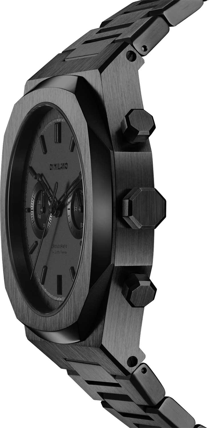 Элегантный хронограф D1 Milano Cronografo CHBJSH Shadow - идеальное воплощение мужественности и стиля. Этот многофункциональный аксессуар оснащен секундомером,тахиметромТахиметрРазмеченная шкала, располагается на ободке или безеле часов. Тахиметр позволяет рассчитать скорость на определённом участке пути, расстояние измеряется в километрах или милях. и двойным форматом времени, что делает его незаменимым компаньоном в повседневной жизни. Корпус и браслет выполнены из стали с PVD-покрытиемPVDУльтратонкое покрытие наносится в технике вакуумного напыления, сочетает в себе нитрид титана особой прочности со слоем золота или оксида хрома. Несёт в себе декоративную или защитную функцию.. Минималистичный дизайн циферблата с штриховыми метками, защищенный прочным сапфировым стекломСапфировое стеклоПрочный и надёжный материал из кристалла сапфира синтетического происхождения, характеризующийся особой твёрдостью и устойчивостью к царапинам и повреждениям., привлекает внимание своей сдержанной красотой. Надежная конструкция с задней крышкой на 8 винтах и стильный браслет с удобной застежкой обеспечивают комфорт при ношении. Каждый экземпляр уникален благодаря индивидуальному серийному номеру. Shadow- это не просто часы, а статусный аксессуар, подчеркивающий безупречный вкус и внимание к деталям своего владельца.