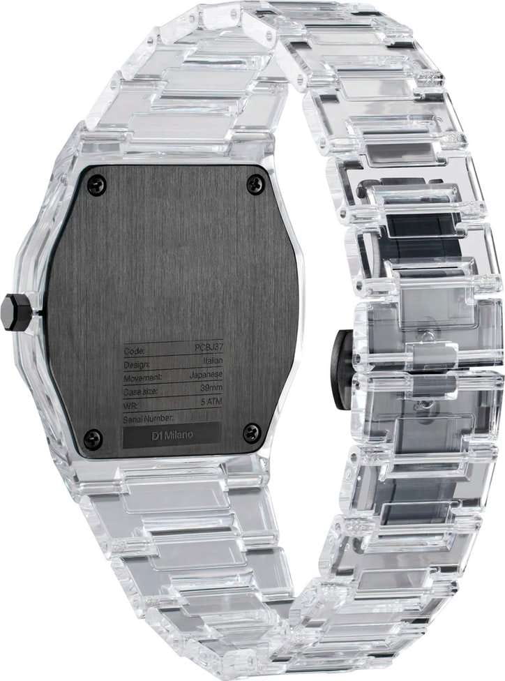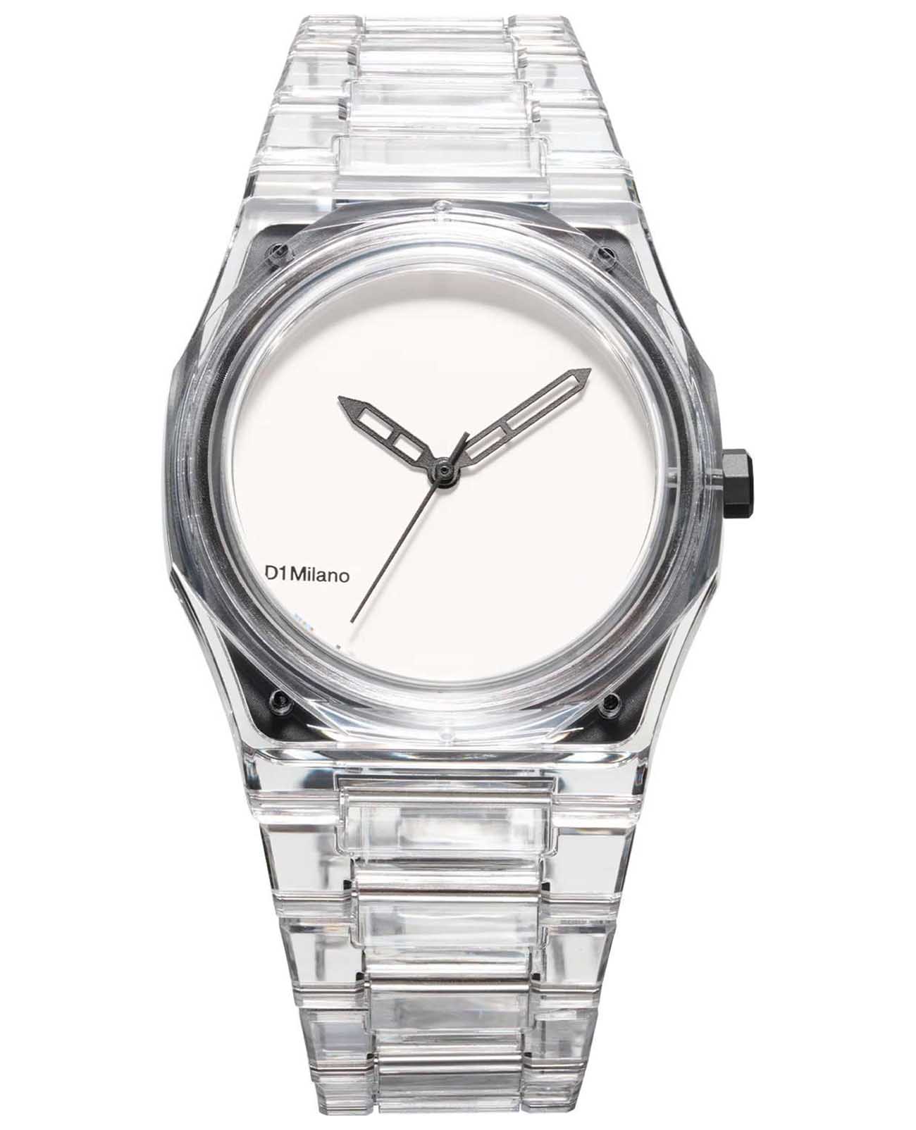 Часы D1 Milano Nylon NYBJ01 – модный и стильный аксессуар-унисекс лаконичного дизайна. Корпус выполнен из прозрачного нейлона. Белый матовый циферблат без индексов. Стрелки-скелетон из латуни. Задняя крышка из стали с черным PVD-покрытиемPVDУльтратонкое покрытие наносится в технике вакуумного напыления, сочетает в себе нитрид титана особой прочности со слоем золота или оксида хрома. Несёт в себе декоративную или защитную функцию. закреплена на 4 винтах. Ремешок из прозрачного нейлона имеет застёжку «бабочка» с кнопкамиЗастёжка "бабочка"Такой вид застёжки дополняется предохранителями, помогающими избежать случайного раскрытия браслета. Обладают изящным исполнением. .