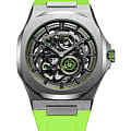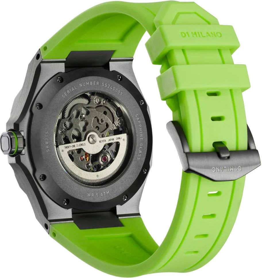 Часы D1 Milano SKRJ15 — это эффектные механические мужские часы, разработанные для ценителей уникальных аксессуаров. Их утонченный дизайн и высокое качество исполнения делают эти часы незаменимым элементом вашего стиля. Изготовленные в Италии, они оснащены надежным механизмом Miyota 8N40 с автоподзаводом, обеспечивающими запас хода до 41 часа. Частота работы механизма составляет 21600 полуколебаний в час. Часы имеют корпус из нержавеющей стали 316L, что гарантирует долговечность и стойкость к внешним воздействиям. Серый скелетонизированный циферблат защищен сапфировым стекломСапфировое стеклоПрочный и надёжный материал из кристалла сапфира синтетического происхождения, характеризующийся особой твёрдостью и устойчивостью к царапинам и повреждениям. с антибликовым покрытием, подчеркивающим элегантность и изысканность модели. Метки в виде штрихов и прозрачная задняя крышка, закрепленная на 8 винтах, придают часам особый шарм. Резиновый ремешок ярко-зеленого цвета со стандартной застежкой обеспечивает комфортное и надежное ношение. Водозащита до 50 метров делает эти часы подходящими для повседневного использования.