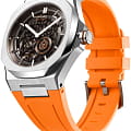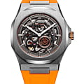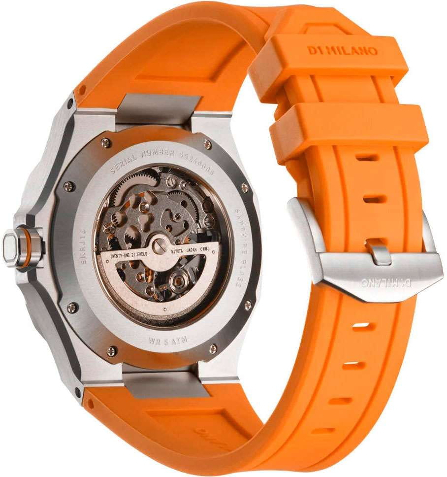 Часы D1 Milano SKRJ16 — это эффектные механические мужские часы, разработанные для ценителей уникальных аксессуаров. Их утонченный дизайн и высокое качество исполнения делают эти часы незаменимым элементом вашего стиля. Изготовленные в Италии, они оснащены надежным механизмом Miyota 8N40 с автоподзаводом, обеспечивающими запас хода до 41 часа. Частота работы механизма составляет 21600 полуколебаний в час. Часы имеют корпус из нержавеющей стали 316L, что гарантирует долговечность и стойкость к внешним воздействиям. Серый скелетонизированный циферблат защищен сапфировым стекломСапфировое стеклоПрочный и надёжный материал из кристалла сапфира синтетического происхождения, характеризующийся особой твёрдостью и устойчивостью к царапинам и повреждениям. с антибликовым покрытием, подчеркивающим элегантность и изысканность модели. Метки в виде штрихов и прозрачная задняя крышка, закрепленная на 8 винтах, придают часам особый шарм. Резиновый ремешок оранжевого цвета со стандартной застежкой обеспечивает комфортное и надежное ношение. Водозащита до 50 метров делает эти часы подходящими для повседневного использования.