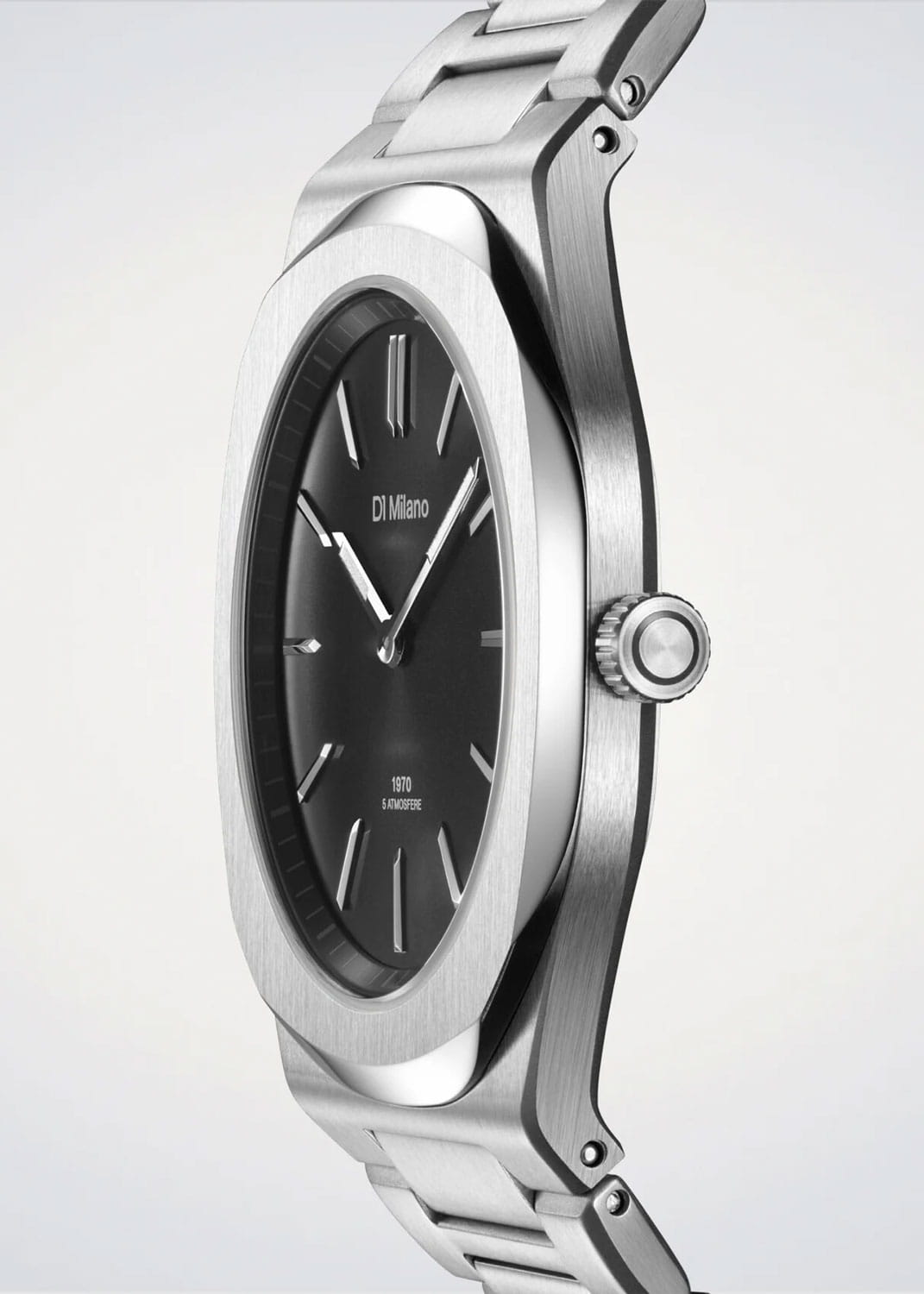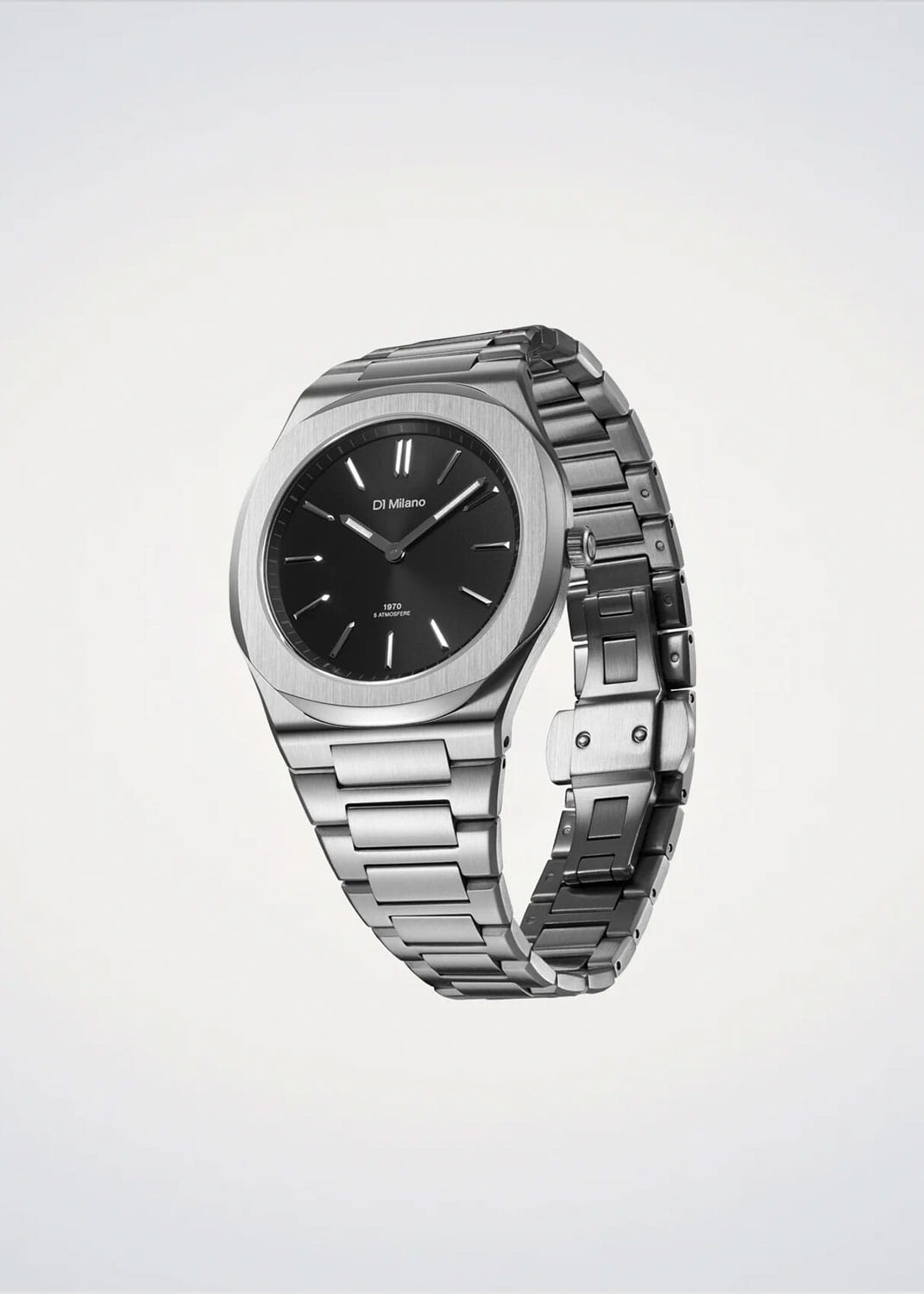 Мужские кварцевые часы D1 Milano Ultra Thin UHBJ01 — это стильное сочетание элегантности и современного дизайна. Изящный ультратонкий корпус выполнен из нержавеющей стали, диаметром 39 мм, что придаст образу элегантности и надежности. Изысканный циферблат с метками в виде штрихов придает модели особый блеск. Циферблат защищен сапфировым стекломСапфировое стеклоПрочный и надёжный материал из кристалла сапфира синтетического происхождения, характеризующийся особой твёрдостью и устойчивостью к царапинам и повреждениям. с антибликовым покрытиемАнтибликовое покрытиеСлой оксида металла в 0,13-0,3 микрон, благодаря которому стекло часов не бликует и не отражает свет. Антибликовое покрытие уменьшает отражение света в 10 раз, обеспечивая отличную читаемость показателей циферблата., обеспечивающий устойчивость к царапинам. Стрелки с люминесцентным покрытиемЛюминесцентное покрытиеПозволяет считывать показания времени в темноте. Производители наносят на стрелки, часовые индексы, безель или поверхность циферблата светонакопительный состав, дающий холодное свечение.. Часы оснащены надежным кварцевым механизмом. Стальной браслет на застёжке-бабочке с кнопкамиЗастёжка "бабочка"Такой вид застёжки дополняется предохранителями, помогающими избежать случайного раскрытия браслета. Обладают изящным исполнением. , гарантирует комфортное и безопасное ношение. Класс водозащиты: 50 метров позволит защитить корпус от случайных брызг или капель дождя. Отличный выбор для тех, кто ценит утонченность и качество.