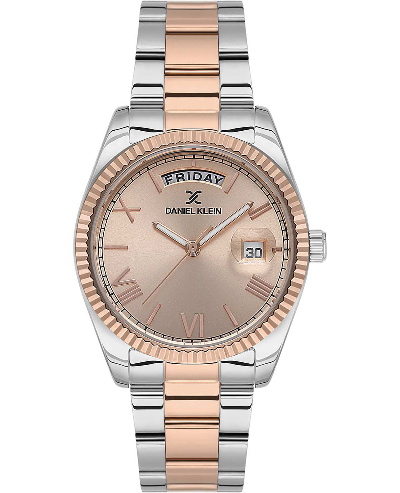 Женские кварцевые часы Daniel Klein — это идеальный повседневный аксессуар для стильной девушки. Корпус диаметром 35 мм выполнен из нержавеющей стали. БезельБезельВнешний ободок, закрепляющий стекло. В спортивных часах так называется поворотное кольцо с делениями на циферблате, выполняет роль таймера – замеряет отрезки времени на шкале. Неподвижный безель – элемент декора. Однонаправленно вращающийся безель на дайверских часах позволяет фиксировать моменты погружения и выныривания на поверхность. с IP-покрытиемIP-покрытиеМетод ионного напыления. Демонстрирует повышенную устойчивость к истиранию, окислению и химическим веществам. Под воздействием высокого давления и температуры около 1500°C молекулы металла надёжно соединяются с частицами корпуса часов. рифлёный. Циферблат золотистого цвета выполнен по технологии Sunray («солнечные лучи») и оформлен штрихами, римскими цифрами и стрелками. Окошко дня недели расположено в положении 12 часов, окошко даты — в положении 3 часов и оснащено увеличительным стеклом (Cyclops). Стрелки с люминесцентным покрытиемЛюминесцентное покрытиеПозволяет считывать показания времени в темноте. Производители наносят на стрелки, часовые индексы, безель или поверхность циферблата светонакопительный состав, дающий холодное свечение., обеспечивающим хорошую читаемость в темноте. Циферблат защищён минеральным стекломМинеральное стеклоМинеральное стекло представляет собой искусственно выращенный минерал кварца. Такое стекло отличается особой устойчивостью к повреждениям и царапинам. Уступает по некоторым качествам сапфировому стеклу.. Часы оснащены стальным браслетом с частичным IP-покрытиемIP-покрытиеМетод ионного напыления. Демонстрирует повышенную устойчивость к истиранию, окислению и химическим веществам. Под воздействием высокого давления и температуры около 1500°C молекулы металла надёжно соединяются с частицами корпуса часов. на раскладной застёжкеРаскладная застёжкаТакой тип застёжки используется только на браслетах из металла. Она никогда не раскрывается полностью, происходит разделение на 2 и более частей. Раскладывающая застёжка снизит вероятность потери часов к минимуму.. Водонепроницаемость 30 м позволяет использовать часы в повседневных условиях. Идеальный выбор для тех, кто ценит турецкое качество и элегантный дизайн.