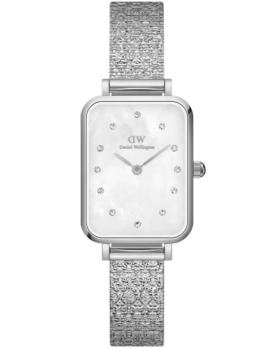 Женские наручные часы с минеральным стекломМинеральное стеклоМинеральное стекло представляет собой искусственно выращенный минерал кварца. Такое стекло отличается особой устойчивостью к повреждениям и царапинам. Уступает по некоторым качествам сапфировому стеклу. Daniel Wellington Quadro DW00100580, кварцевый механизм с высокой точностью. Корпус часов изготовлен из нержавеющей стали 316L. Циферблат украшен фирменным логотипом Daniel Wellington и 12 кристаллами Swarovski. Рифленая заводная головка. Класс водозащиты: 30 метров, позволит защитить корпус от случайных брызг или капель дождя. Стальной браслет миланского плетения на раскладном замкеРаскладной замокДанный вариант застежки используется только на часах с металлическим браслетом. Отличительная особенность такого крепления в том, что длина браслета становится универсальной и вы можете самостоятельно отрегулировать нужный вам размер – застежка просто двигается по браслету часов..