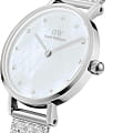 Женские наручные часы с минеральным стекломМинеральное стеклоМинеральное стекло представляет собой искусственно выращенный минерал кварца. Такое стекло отличается особой устойчивостью к повреждениям и царапинам. Уступает по некоторым качествам сапфировому стеклу. Daniel Wellington Petite Lumine Pressed Piano DW00100592, кварцевый механизм с высокой точностью. Класс водозащиты: 30 метров, позволит защитить корпус от случайных брызг или капель дождя. Корпус часов изготовлен из стали. Стальной браслет на раскладной застёжкеРаскладная застёжкаТакой тип застёжки используется только на браслетах из металла. Она никогда не раскрывается полностью, происходит разделение на 2 и более частей. Раскладывающая застёжка снизит вероятность потери часов к минимуму.с рельефным рисунком в виде облаков. Перламутровый циферблат. Накладные метки в виде точек из кристаллов. Рифленая заводная головка. Индивидуальный серийный номер.