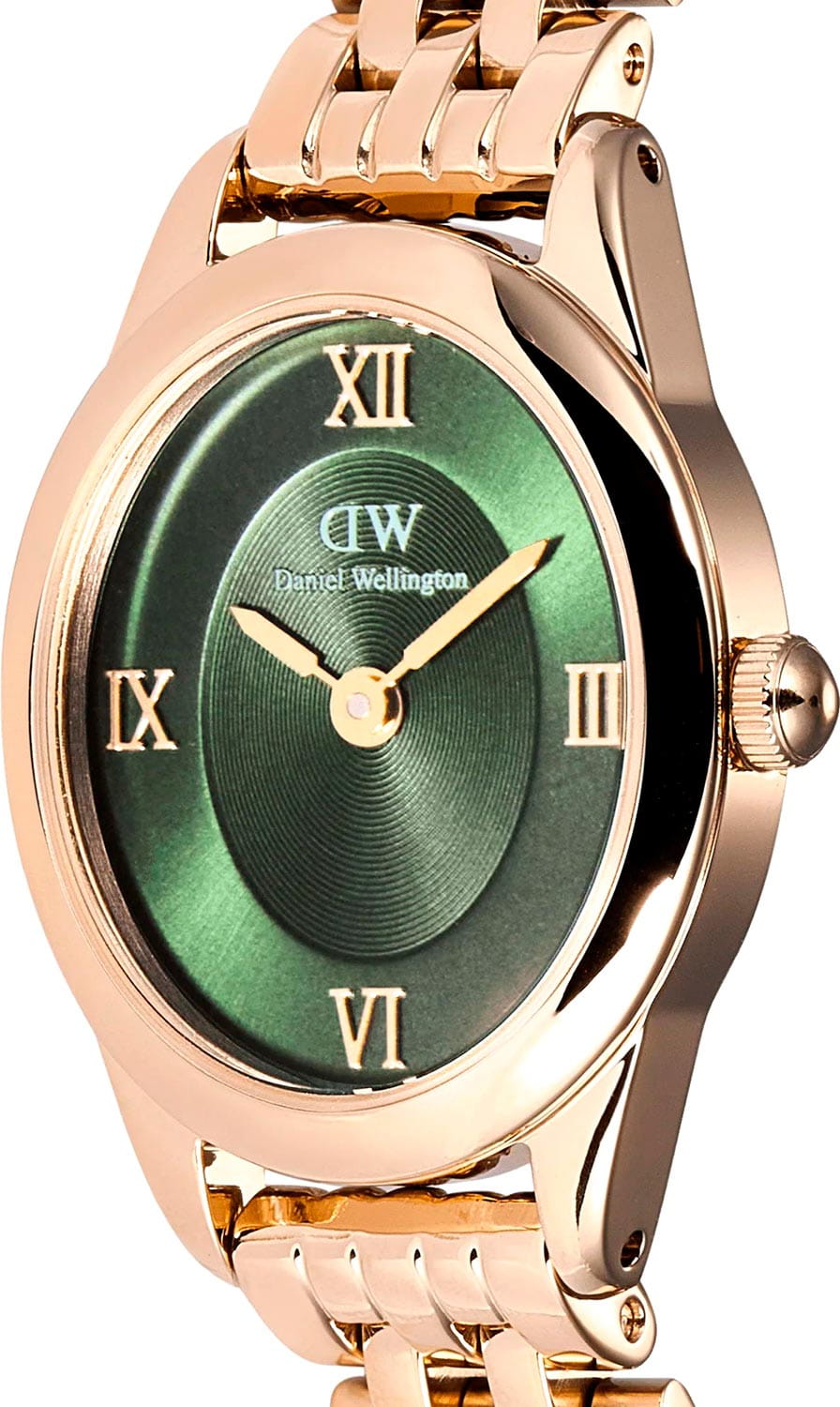 Daniel Wellington Ophelia — женственные часы с овальным корпусом 22 мм из нержавеющей стали с изящным PVDPVDУльтратонкое покрытие наносится в технике вакуумного напыления, сочетает в себе нитрид титана особой прочности со слоем золота или оксида хрома. Несёт в себе декоративную или защитную функцию.-покрытием в цвете розового золота. Глубокий циферблат с радиальным переливом украшен римскими индексами, что придаёт образу классическую элегантность.