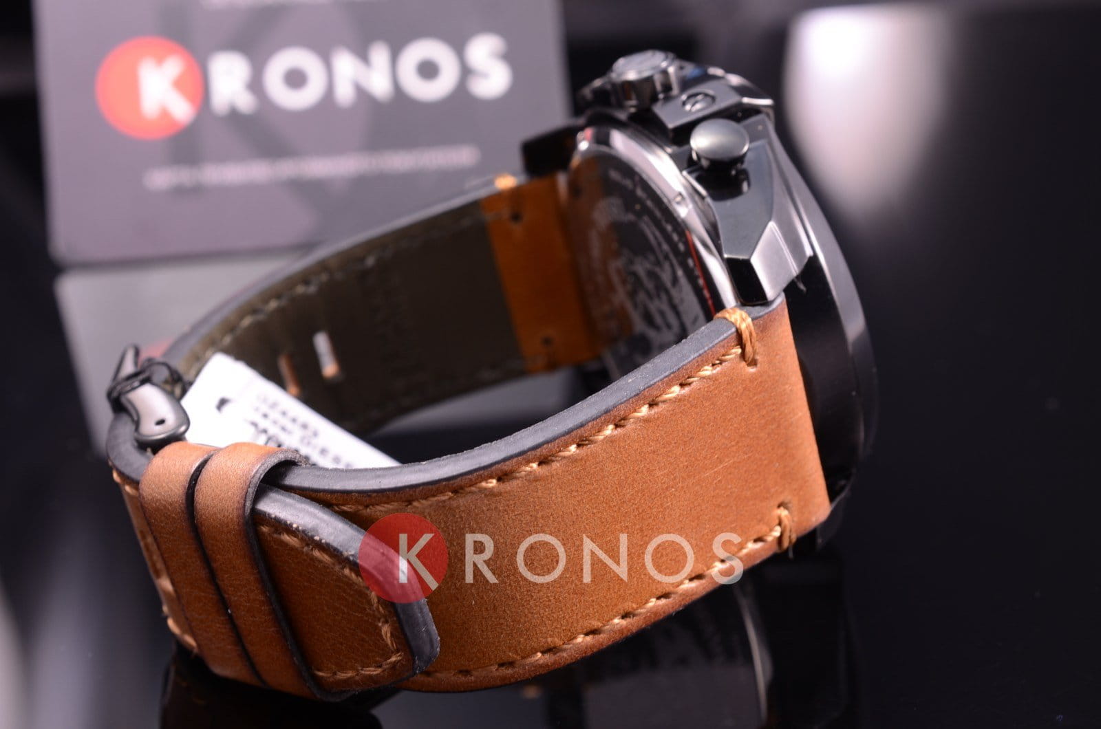 Точный кварцевый механизм. Центральная секундная стрелка. Минеральное стекло устойчивое к возникновению царапин. Светонакопительный состав на стрелках. Массивный корпус из высококачественной нержавеющей стали со стойким PVD покрытием. Водозащита до 10 АТМ. Ремешок из натуральной кожи коричневого. Часы оснащены хронографом.
