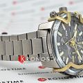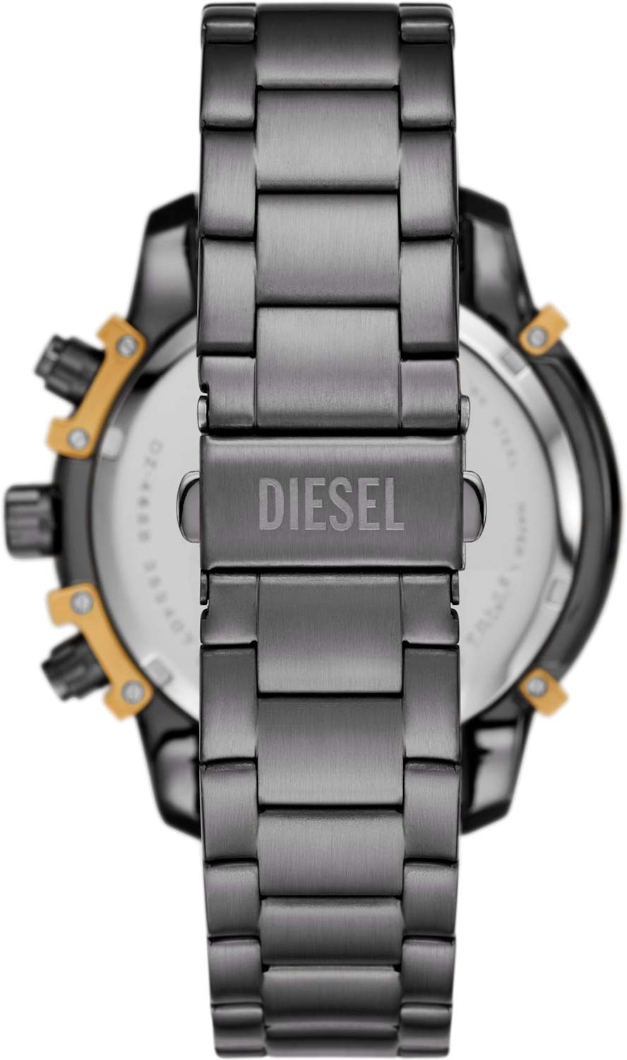 Мужские кварцевые часы-хронограф Diesel DZ4668 — это стильный аксессуар, который подчеркнёт ваш индивидуальный вкус и поможет не упустить ни минуты в стремительном ритме жизни. Модель выполнена в круглой форме с корпусом из стали с темно-серым покрытием и деталями в цвете желтого золота, что придаёт ей привлекательный внешний вид и устойчивость к царапинам. Циферблат серого цвета оформлен по технологии Sunray, создающей эффект солнечных лучей, а его поверхность защищена минеральным стекломМинеральное стеклоМинеральное стекло представляет собой искусственно выращенный минерал кварца. Такое стекло отличается особой устойчивостью к повреждениям и царапинам. Уступает по некоторым качествам сапфировому стеклу., устойчивым к повседневным нагрузкам. Часы оснащены функцией хронографа, что делает их удобными для измерения времени с высокой точностью. Окошко даты расположено в положении 9 часов, а метки выполнены в виде штрихов. Время отображается в 12- и 24-часовом формате, что делает модель универсальной для использования в разных условиях. Заводная головка и кнопки управления хронографом размещены слева, обеспечивая комфортное ношение на правой руке. Браслет из стали с покрытием шириной 22 мм оснащён раскладной застёжкойРаскладная застёжкаТакой тип застёжки используется только на браслетах из металла. Она никогда не раскрывается полностью, происходит разделение на 2 и более частей. Раскладывающая застёжка снизит вероятность потери часов к минимуму. с двумя кнопками, что гарантирует надёжную фиксацию и удобство при использовании. Часы водонепроницаемы до 50 метров (, что позволяет использовать их в повседневных условиях — при мытье рук или под лёгким дождём. Эти часы станут универсальным аксессуаром для тех, кто ценит сочетание стиля, функциональности и качества — идеальный выбор для уверенных в себе мужчин, следящих за своим имиджем и предпочитающих выделяться.