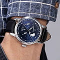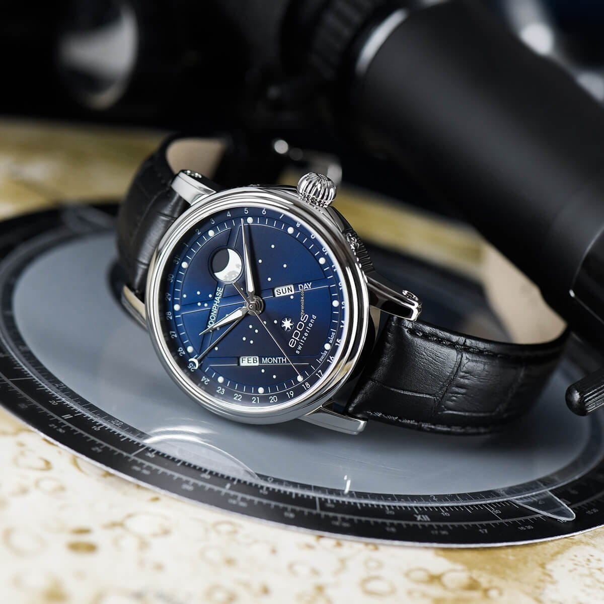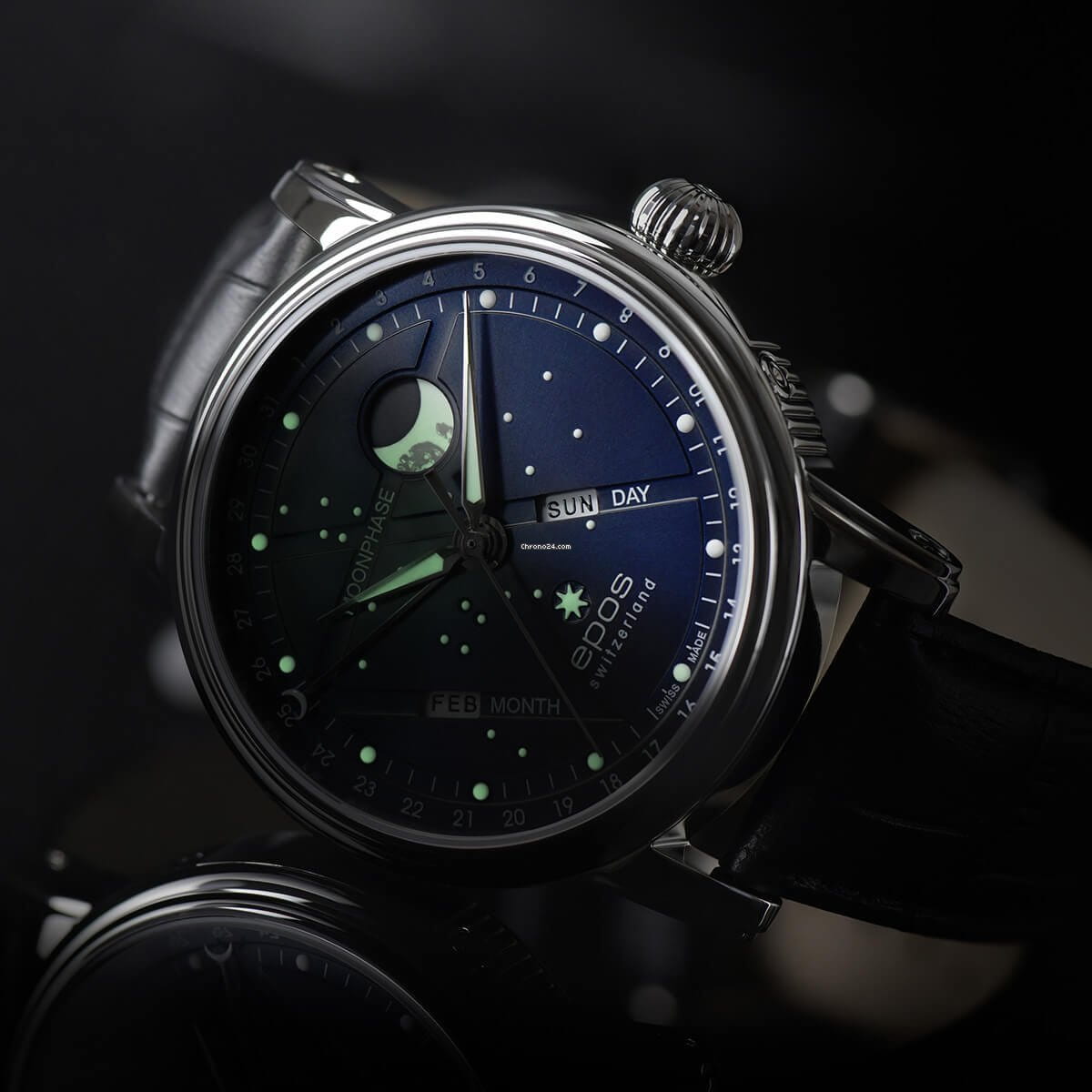 Мужские швейцарские механические часы с автоподзаводом Epos Oeuvre d'art 3439.322.20.16.25. Сапфировое стеклоСапфировое стеклоПрочный и надёжный материал из кристалла сапфира синтетического происхождения, характеризующийся особой твёрдостью и устойчивостью к царапинам и повреждениям. устойчивое к появлению царапин, обладающее высокой прозрачностью. Корпус часов изготовлен из нержавеющей стали. Стрелки и метки с люминесцентной подсветкойЛюминесцентное покрытиеПозволяет считывать показания времени в темноте. Производители наносят на стрелки, часовые индексы, безель или поверхность циферблата светонакопительный состав, дающий холодное свечение.. Часы с автоподзаводом и фазой луны с люминесцентной полярной звездой. Циферблат выполнен по технологии Sunray (солнечные лучи). Календарь. Прозрачная задняя крышка. Класс водозащиты: 50 метров, позволит защитить корпус от случайных брызг или капель дождя. Кожаный ремешок на стандартной застёжке.