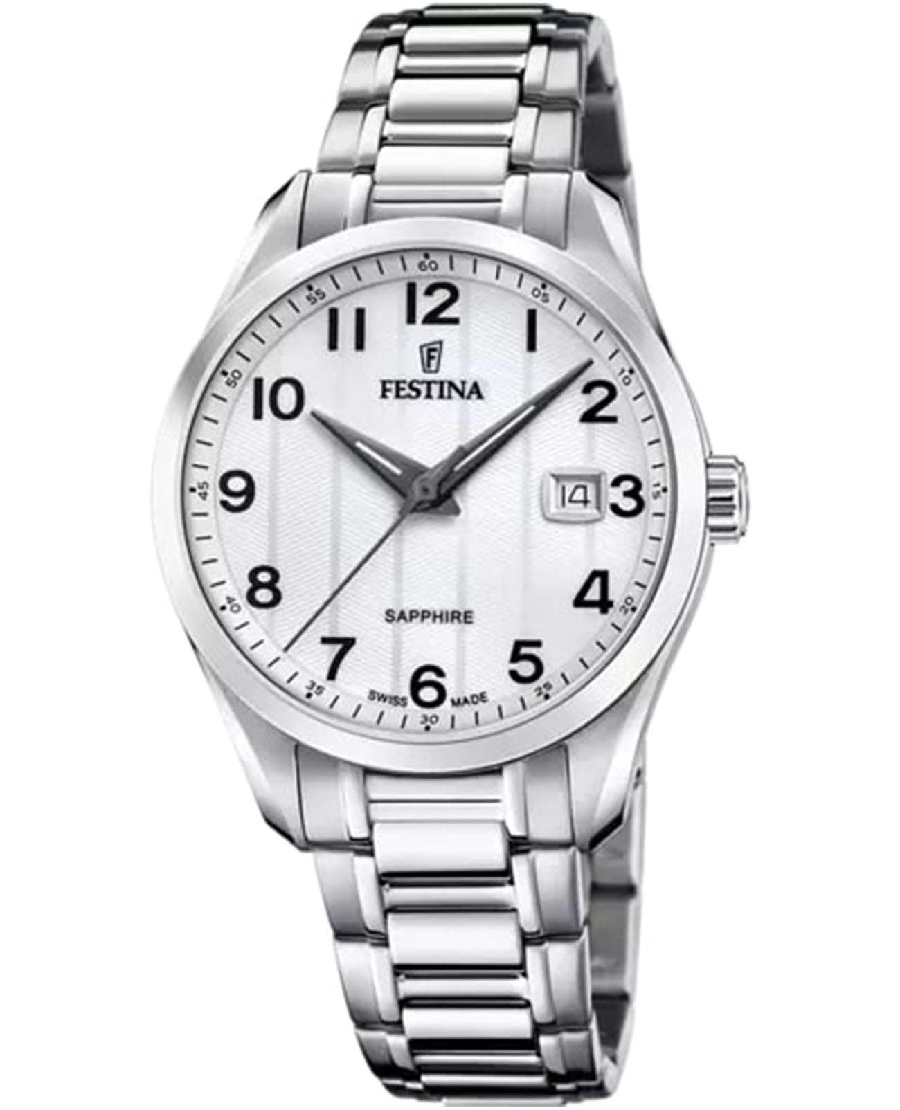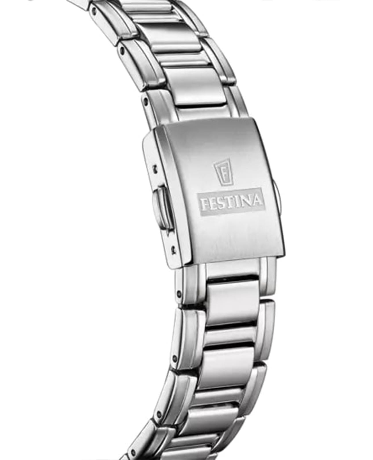 Практичные и стильные часы Festina F20026/1 с круглым корпусом на стальном браслете идеальны для современного ритма жизни. Кварцевый механизм с высокой точностью. Сапфировое стеклоСапфировое стеклоПрочный и надёжный материал из кристалла сапфира синтетического происхождения, характеризующийся особой твёрдостью и устойчивостью к царапинам и повреждениям. устойчивое к появлению царапин, обладающее высокой прозрачностью. Класс водозащиты: 50 метров, позволит защитить корпус от случайных брызг или капель дождя. Корпус часов изготовлен из нержавеющей стали. Браслет с раскладной застёжкойРаскладная застёжкаТакой тип застёжки используется только на браслетах из металла. Она никогда не раскрывается полностью, происходит разделение на 2 и более частей. Раскладывающая застёжка снизит вероятность потери часов к минимуму.. Стрелки с люминесцентным покрытиемЛюминесцентное покрытиеПозволяет считывать показания времени в темноте. Производители наносят на стрелки, часовые индексы, безель или поверхность циферблата светонакопительный состав, дающий холодное свечение.. Окошко даты находится в положении 3 часа.