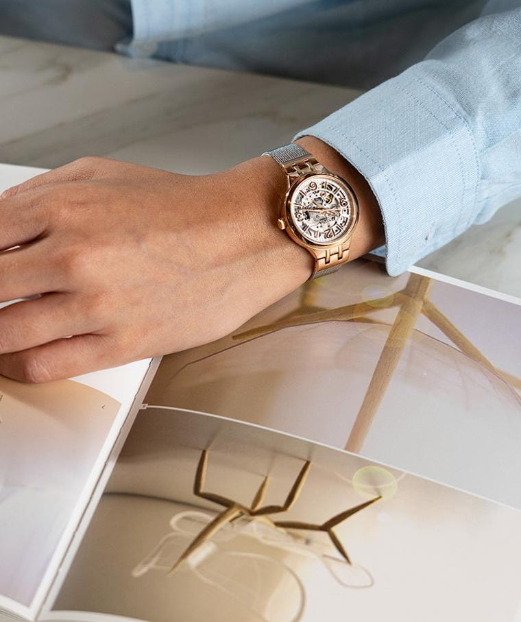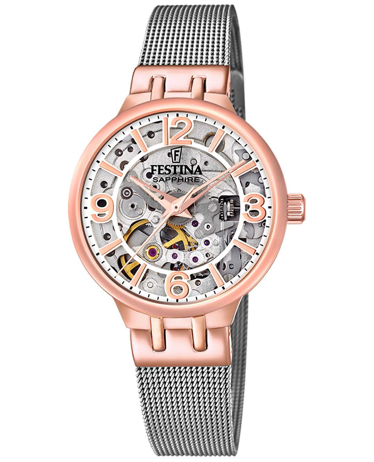 Женские механические часы-скелетоны Festina Automatic F20581/1, механический механизм (автоматический калибр) с высокой точностью. Сапфировое стеклоСапфировое стеклоПрочный и надёжный материал из кристалла сапфира синтетического происхождения, характеризующийся особой твёрдостью и устойчивостью к царапинам и повреждениям. устойчивое к появлению царапин, обладающее высокой прозрачностью. Класс водозащиты: 50 метров, позволит защитить корпус от случайных брызг или капель дождя. Корпус часов изготовлен из стали с PVD-покрытиемPVDУльтратонкое покрытие наносится в технике вакуумного напыления, сочетает в себе нитрид титана особой прочности со слоем золота или оксида хрома. Несёт в себе декоративную или защитную функцию.. Стальной миланского плетения браслет на раскладной застёжкеРаскладная застёжкаТакой тип застёжки используется только на браслетах из металла. Она никогда не раскрывается полностью, происходит разделение на 2 и более частей. Раскладывающая застёжка снизит вероятность потери часов к минимуму.. БезельБезельВнешний ободок, закрепляющий стекло. В спортивных часах так называется поворотное кольцо с делениями на циферблате, выполняет роль таймера – замеряет отрезки времени на шкале. Неподвижный безель – элемент декора. Однонаправленно вращающийся безель на дайверских часах позволяет фиксировать моменты погружения и выныривания на поверхность. с PVD-покрытиемPVDУльтратонкое покрытие наносится в технике вакуумного напыления, сочетает в себе нитрид титана особой прочности со слоем золота или оксида хрома. Несёт в себе декоративную или защитную функцию.. Циферблат с метками в виде штрихов и арабских цифр. Рифленая заводная головка.