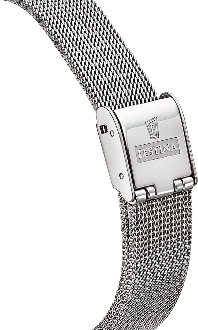 Стильные часы придутся по душе любой девушке. Кварцевый механизм с высокой точностью. Минеральное стеклоМинеральное стеклоМинеральное стекло представляет собой искусственно выращенный минерал кварца. Такое стекло отличается особой устойчивостью к повреждениям и царапинам. Уступает по некоторым качествам сапфировому стеклу. устойчивое к появлению царапин, обладающее высокой прозрачностью. Класс водозащиты: 50 метров, позволит защитить корпус от случайных брызг или капель дождя. Корпус часов изготовлен из нержавеющей стали 316L. БезельБезельВнешний ободок, закрепляющий стекло. В спортивных часах так называется поворотное кольцо с делениями на циферблате, выполняет роль таймера – замеряет отрезки времени на шкале. Неподвижный безель – элемент декора. Однонаправленно вращающийся безель на дайверских часах позволяет фиксировать моменты погружения и выныривания на поверхность. украшен цирконами. Браслет миланского плетения с раскладной застёжкойРаскладная застёжкаТакой тип застёжки используется только на браслетах из металла. Она никогда не раскрывается полностью, происходит разделение на 2 и более частей. Раскладывающая застёжка снизит вероятность потери часов к минимуму..