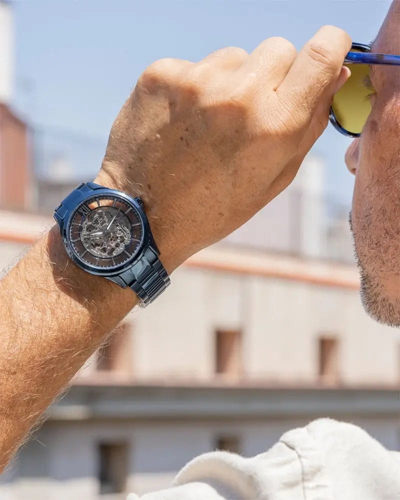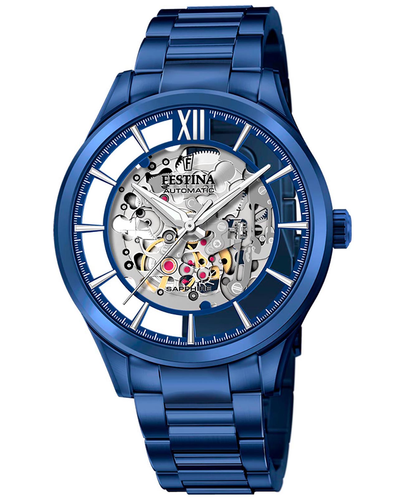Мужские механические часы-скелетоны Festina Automatic F20631/1, механический механизм (автоматический калибр) с высокой точностью. Сапфировое стеклоСапфировое стеклоПрочный и надёжный материал из кристалла сапфира синтетического происхождения, характеризующийся особой твёрдостью и устойчивостью к царапинам и повреждениям. устойчивое к появлению царапин, обладающее высокой прозрачностью. Класс водозащиты: 50 метров, позволит защитить корпус от случайных брызг или капель дождя. Корпус часов изготовлен из стали с PVD-покрытиемPVDУльтратонкое покрытие наносится в технике вакуумного напыления, сочетает в себе нитрид титана особой прочности со слоем золота или оксида хрома. Несёт в себе декоративную или защитную функцию.. Стальной браслет на раскладной застёжкеРаскладная застёжкаТакой тип застёжки используется только на браслетах из металла. Она никогда не раскрывается полностью, происходит разделение на 2 и более частей. Раскладывающая застёжка снизит вероятность потери часов к минимуму. с PVD-покрытиемPVDУльтратонкое покрытие наносится в технике вакуумного напыления, сочетает в себе нитрид титана особой прочности со слоем золота или оксида хрома. Несёт в себе декоративную или защитную функцию.. Циферблат с метками в виде штрихов и римской цифры 12. Рифленая заводная головка. Стрелки и метки с люминесцентным покрытиемЛюминесцентное покрытиеПозволяет считывать показания времени в темноте. Производители наносят на стрелки, часовые индексы, безель или поверхность циферблата светонакопительный состав, дающий холодное свечение..