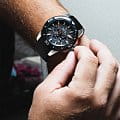 Часы-хронографХронографФункция позволяет измерять отрезки времени с особой точностью: часы, минуты, секунды. Верным признаком хронографа является наличие на циферблате 3 дополнительных окошек-счётчиков.. Кварцевый механизм с высокой точностью. Минеральное стеклоМинеральное стеклоМинеральное стекло представляет собой искусственно выращенный минерал кварца. Такое стекло отличается особой устойчивостью к повреждениям и царапинам. Уступает по некоторым качествам сапфировому стеклу. устойчивое к появлению царапин, обладающее высокой прозрачностью. Класс водозащиты: 100 метров, позволит плавать, нырять и заниматься другими водными видами спорта. Безель c PVD-покрытиемPVDУльтратонкое покрытие наносится в технике вакуумного напыления, сочетает в себе нитрид титана особой прочности со слоем золота или оксида хрома. Несёт в себе декоративную или защитную функцию.. Стрелки и метки с люминесцентным покрытиемЛюминесцентное покрытиеПозволяет считывать показания времени в темноте. Производители наносят на стрелки, часовые индексы, безель или поверхность циферблата светонакопительный состав, дающий холодное свечение.. Корпус часов изготовлен из нержавеющей стали. Каучуковый ремешок с классической застежкой