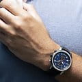 Модель оснащена кварцевым механизмом с функцией хронографаХронографФункция позволяет измерять отрезки времени с особой точностью: часы, минуты, секунды. Верным признаком хронографа является наличие на циферблате 3 дополнительных окошек-счётчиков., обеспечивающим высокую точность хода.