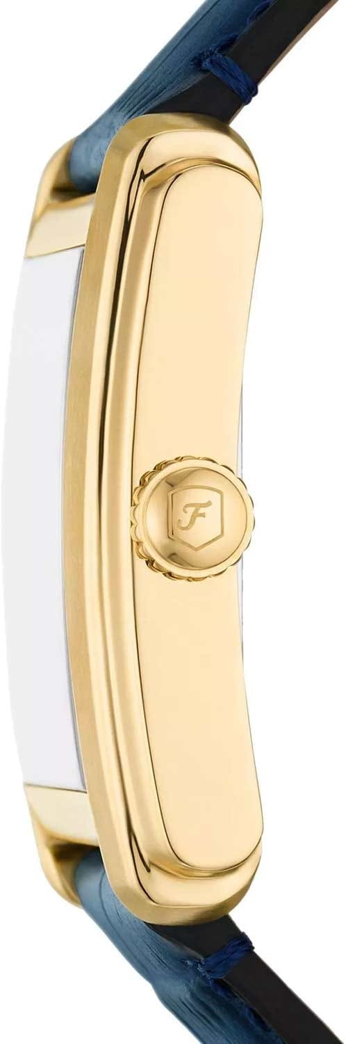 Часы Fossil FS6076 идеально подойдут для тех, кто ценит классический стиль, дополненный современными деталями, и ищет аксессуар, способный подчеркнуть их индивидуальность и элегантность. Эти мужские наручные часы производятся в США и оснащены надежным кварцевым механизмом, который обеспечивает точность и стабильность в работе. Прямоугольный корпус из стали с золотистым IP-покрытиемIP-покрытиеМетод ионного напыления. Демонстрирует повышенную устойчивость к истиранию, окислению и химическим веществам. Под воздействием высокого давления и температуры около 1500°C молекулы металла надёжно соединяются с частицами корпуса часов. гарантирует долговечность и придает часам стильный и современный вид. Серебристый циферблат, выполненный по технологии Sunray, создает эффект солнечных лучей, что добавляет глубину и изысканность дизайну. Метки в виде римских цифр придают циферблату классический акцент, а рифленая заводная головка облегчает настройку времени. Стрелки с люминесцентным покрытиемЛюминесцентное покрытиеПозволяет считывать показания времени в темноте. Производители наносят на стрелки, часовые индексы, безель или поверхность циферблата светонакопительный состав, дающий холодное свечение. позволяют легко считывать время даже в условиях низкой освещенности. Часы оснащены удобным кожаным синим ремешком с классической застежкой, который обеспечивает комфортное ношение и надежную фиксацию на запястье. Ширина ремешка составляет 22 мм, а длина — 200 мм, что делает их подходящими для большинства запястий. Водозащита уровня 50WR защищает механизм от случайных брызг, а минеральное стеклоМинеральное стеклоМинеральное стекло представляет собой искусственно выращенный минерал кварца. Такое стекло отличается особой устойчивостью к повреждениям и царапинам. Уступает по некоторым качествам сапфировому стеклу. оберегает циферблат от царапин и повреждений.