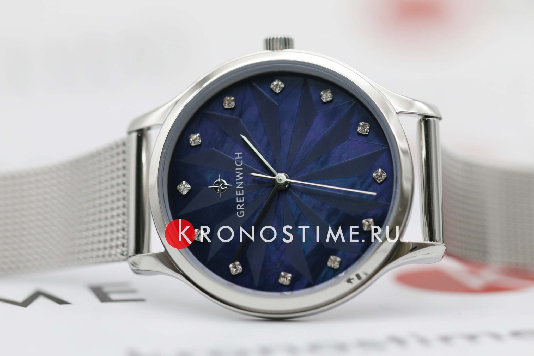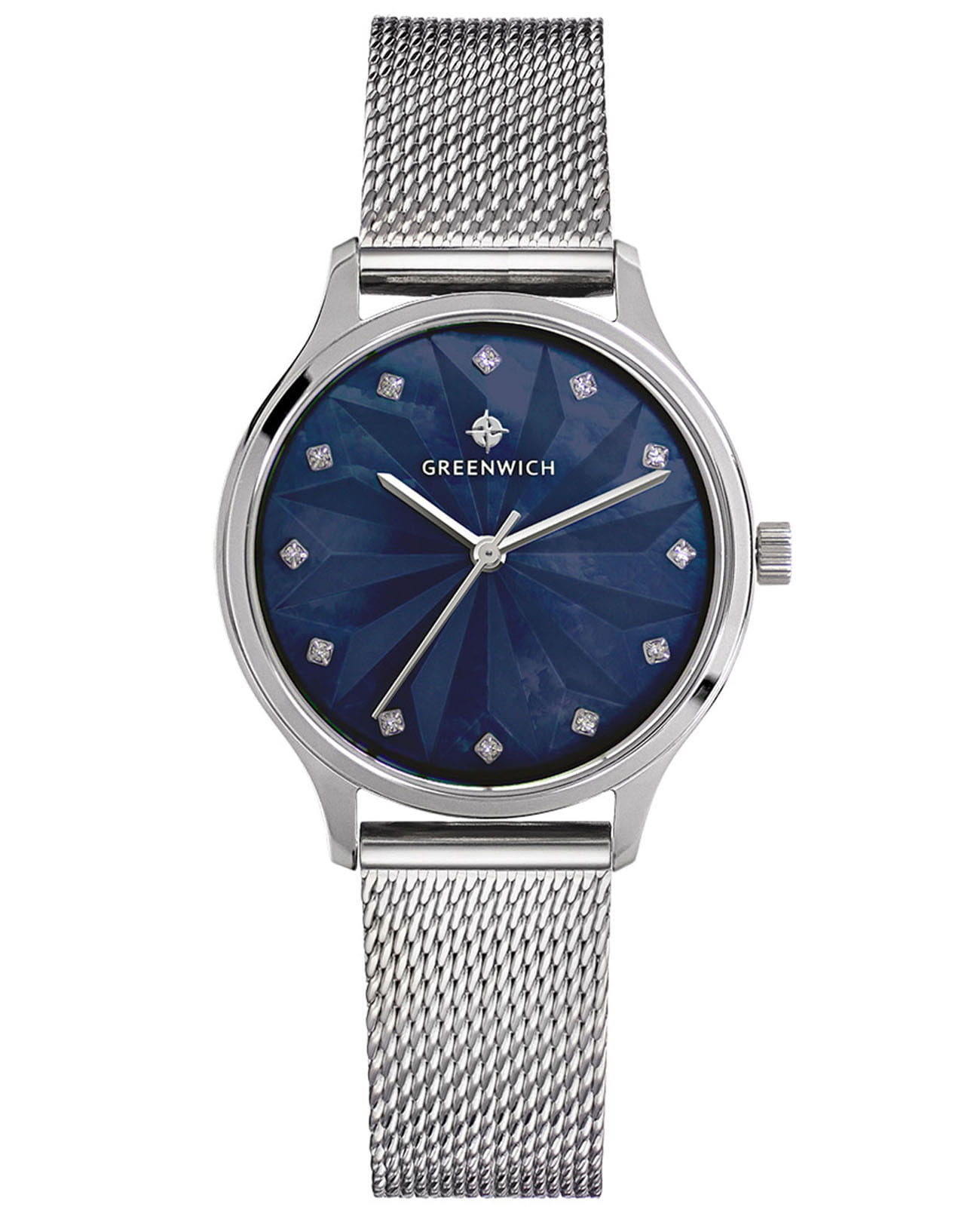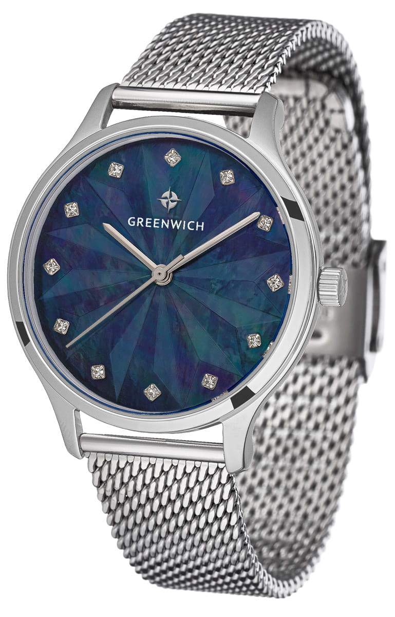 Женские английские часы Greenwich GW 341.19.56, кварцевый механизм с высокой точностью. Класс водозащиты: 30 метров, позволит защитить корпус от случайных брызг или капель дождя. Корпус часов изготовлен из стали. Браслет с раскладной застёжкойРаскладная застёжкаТакой тип застёжки используется только на браслетах из металла. Она никогда не раскрывается полностью, происходит разделение на 2 и более частей. Раскладывающая застёжка снизит вероятность потери часов к минимуму.. Циферблат сделан из темно-синего перламутра и украшен необычной гравировкой. Фианиты, исполняющие функцию маркеров часов, надежно закреплены в кастах.