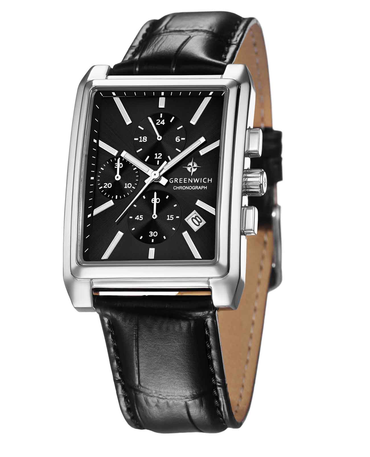Часы Greenwich GW 553.11.11 из коллекции Galeon Chrono — элегантная мужская модель, сочетающая спортивный функционал и классическую элегантность. Корпус размером 33 x 40 мм выполнен из нержавеющей стали. Чёрный циферблат с тремя дополнительными циферблатами: минутным и секундным хронографами, а также 24-часовым индикатором, защищён минеральным стекломМинеральное стеклоМинеральное стекло представляет собой искусственно выращенный минерал кварца. Такое стекло отличается особой устойчивостью к повреждениям и царапинам. Уступает по некоторым качествам сапфировому стеклу.. Стрелки и часовые метки оснащены люминесцентным покрытием для удобного считывания в темноте.