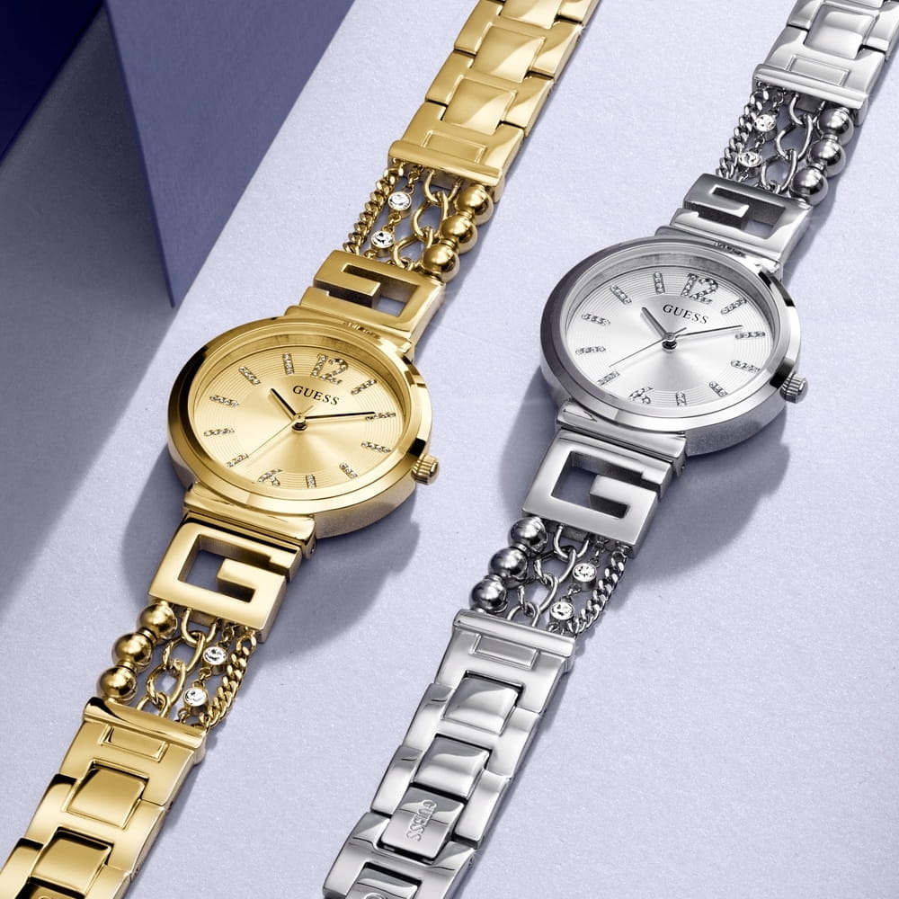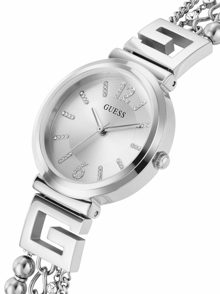 Женские кварцевые наручные часы с минеральным стекломМинеральное стеклоМинеральное стекло представляет собой искусственно выращенный минерал кварца. Такое стекло отличается особой устойчивостью к повреждениям и царапинам. Уступает по некоторым качествам сапфировому стеклу. Guess G Cluster GW0545L1, кварцевый механизм с высокой точностью. Класс водозащиты: 30 метров, позволит защитить корпус от случайных брызг или капель дождя. Корпус часов изготовлен из стали. Стальной браслет на ювелирной застёжке. Циферблат инкрустирован кристаллами.