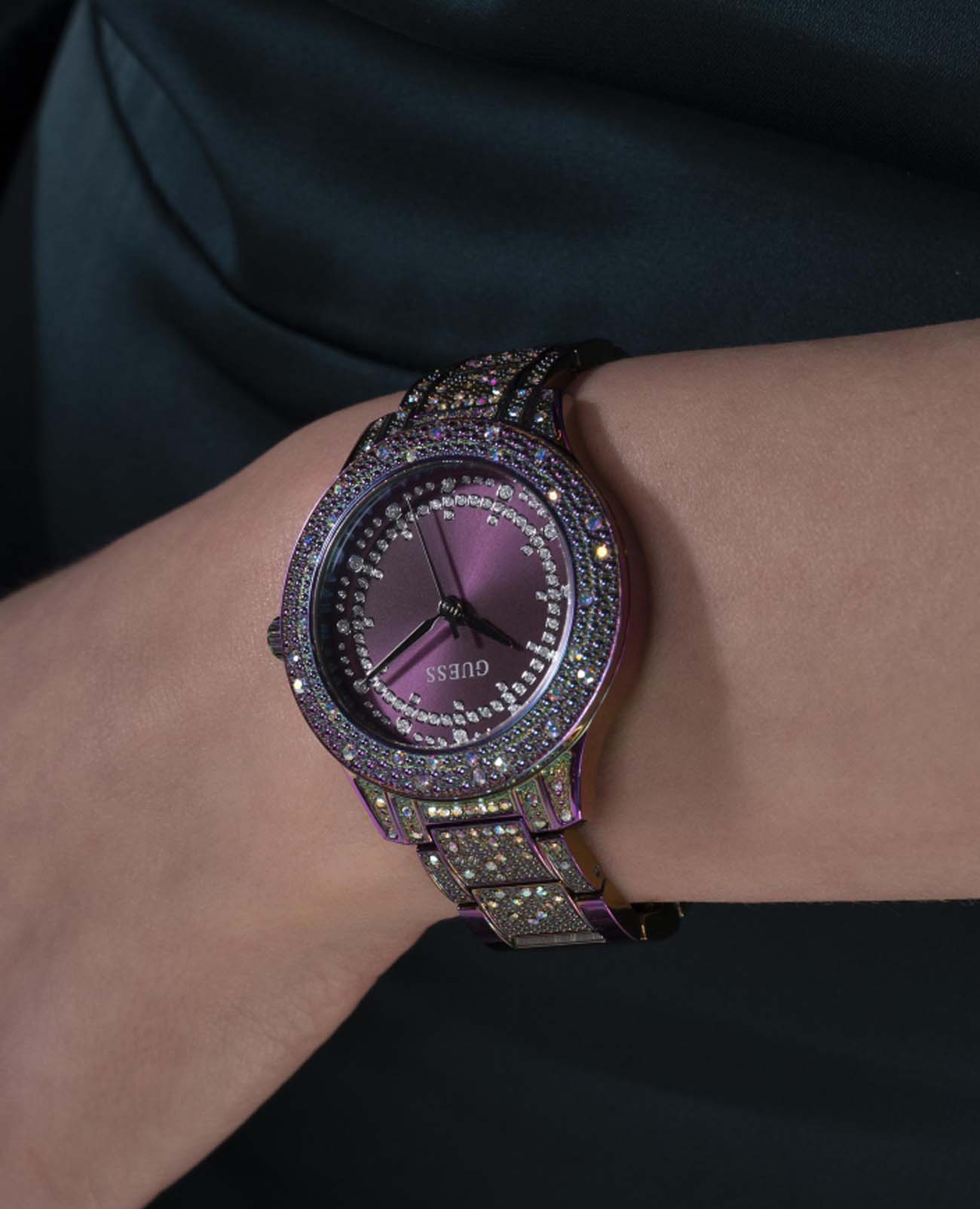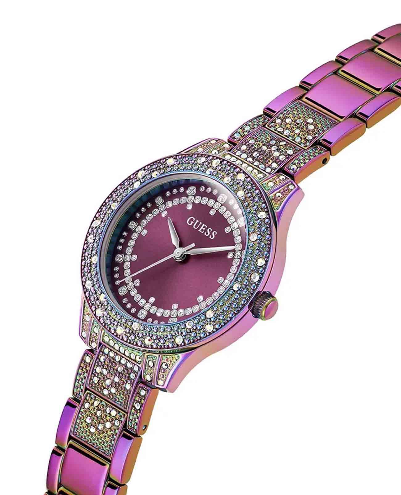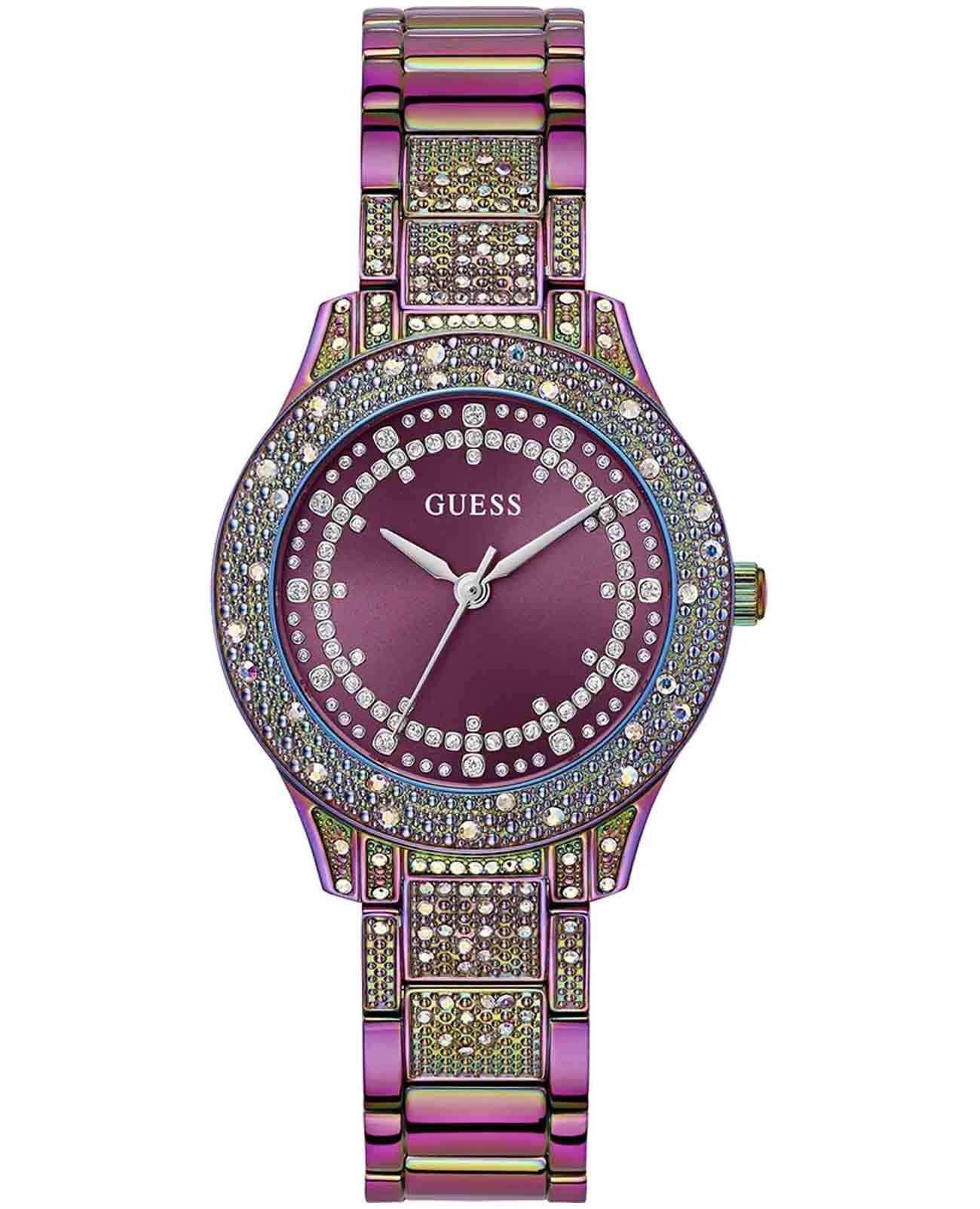 Женские наручные часы с минеральным стекломМинеральное стеклоМинеральное стекло представляет собой искусственно выращенный минерал кварца. Такое стекло отличается особой устойчивостью к повреждениям и царапинам. Уступает по некоторым качествам сапфировому стеклу. Guess Trend GW0746L3, кварцевый механизм с высокой точностью. Корпус часов изготовлен из стали с IP-покрытиемIP-покрытиеМетод ионного напыления. Демонстрирует повышенную устойчивость к истиранию, окислению и химическим веществам. Под воздействием высокого давления и температуры около 1500°C молекулы металла надёжно соединяются с частицами корпуса часов.. БезельБезельВнешний ободок, закрепляющий стекло. В спортивных часах так называется поворотное кольцо с делениями на циферблате, выполняет роль таймера – замеряет отрезки времени на шкале. Неподвижный безель – элемент декора. Однонаправленно вращающийся безель на дайверских часах позволяет фиксировать моменты погружения и выныривания на поверхность. из стали с IP-покрытиемIP-покрытиеМетод ионного напыления. Демонстрирует повышенную устойчивость к истиранию, окислению и химическим веществам. Под воздействием высокого давления и температуры около 1500°C молекулы металла надёжно соединяются с частицами корпуса часов.,  корпус и циферблат украшены кристаллами. Класс водозащиты: 30 метров, позволит защитить корпус от случайных брызг или капель дождя. Стальной браслет с IP-покрытиемIP-покрытиеМетод ионного напыления. Демонстрирует повышенную устойчивость к истиранию, окислению и химическим веществам. Под воздействием высокого давления и температуры около 1500°C молекулы металла надёжно соединяются с частицами корпуса часов. на раскладной застёжкеРаскладная застёжкаТакой тип застёжки используется только на браслетах из металла. Она никогда не раскрывается полностью, происходит разделение на 2 и более частей. Раскладывающая застёжка снизит вероятность потери часов к минимуму..
