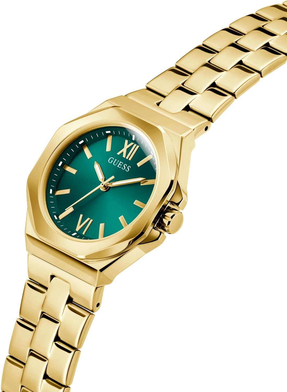 Часы Guess GW0873L2 — это изысканный аксессуар, который станет отличным дополнением к образу современной женщины. Эти наручные оснащены надежным кварцевым механизмом. Стальной корпус с золотистым IP-покрытиемIP-покрытиеМетод ионного напыления. Демонстрирует повышенную устойчивость к истиранию, окислению и химическим веществам. Под воздействием высокого давления и температуры около 1500°C молекулы металла надёжно соединяются с частицами корпуса часов. придаёт часам элегантный и стильный вид. Зеленый циферблат, выполненный по технологии Sunray, создает эффект солнечных лучей, добавляя глубину и выразительность дизайну. Метки в виде штрихов и римские цифры VI и XII обеспечивают удобное считывание времени и добавляют классический штрих. Люминесцентное покрытиеЛюминесцентное покрытиеПозволяет считывать показания времени в темноте. Производители наносят на стрелки, часовые индексы, безель или поверхность циферблата светонакопительный состав, дающий холодное свечение. на стрелках обеспечивает отличную видимость в темноте. Часы оснащены рифленой заводной головкой с защитой, что обеспечивает удобство и надежность в использовании. Стальной браслет с золотистым IP-покрытиемIP-покрытиеМетод ионного напыления. Демонстрирует повышенную устойчивость к истиранию, окислению и химическим веществам. Под воздействием высокого давления и температуры около 1500°C молекулы металла надёжно соединяются с частицами корпуса часов. и раскладной застежкойРаскладная застёжкаТакой тип застёжки используется только на браслетах из металла. Она никогда не раскрывается полностью, происходит разделение на 2 и более частей. Раскладывающая застёжка снизит вероятность потери часов к минимуму. гарантирует комфортное ношение и надежную фиксацию на запястье. Водозащита 50WR позволяет не беспокоиться о случайных брызгах и контакте с водой. Минеральное стеклоМинеральное стеклоМинеральное стекло представляет собой искусственно выращенный минерал кварца. Такое стекло отличается особой устойчивостью к повреждениям и царапинам. Уступает по некоторым качествам сапфировому стеклу. защищает циферблат от царапин и повреждений, обеспечивая долговечность и сохранность внешнего вида.