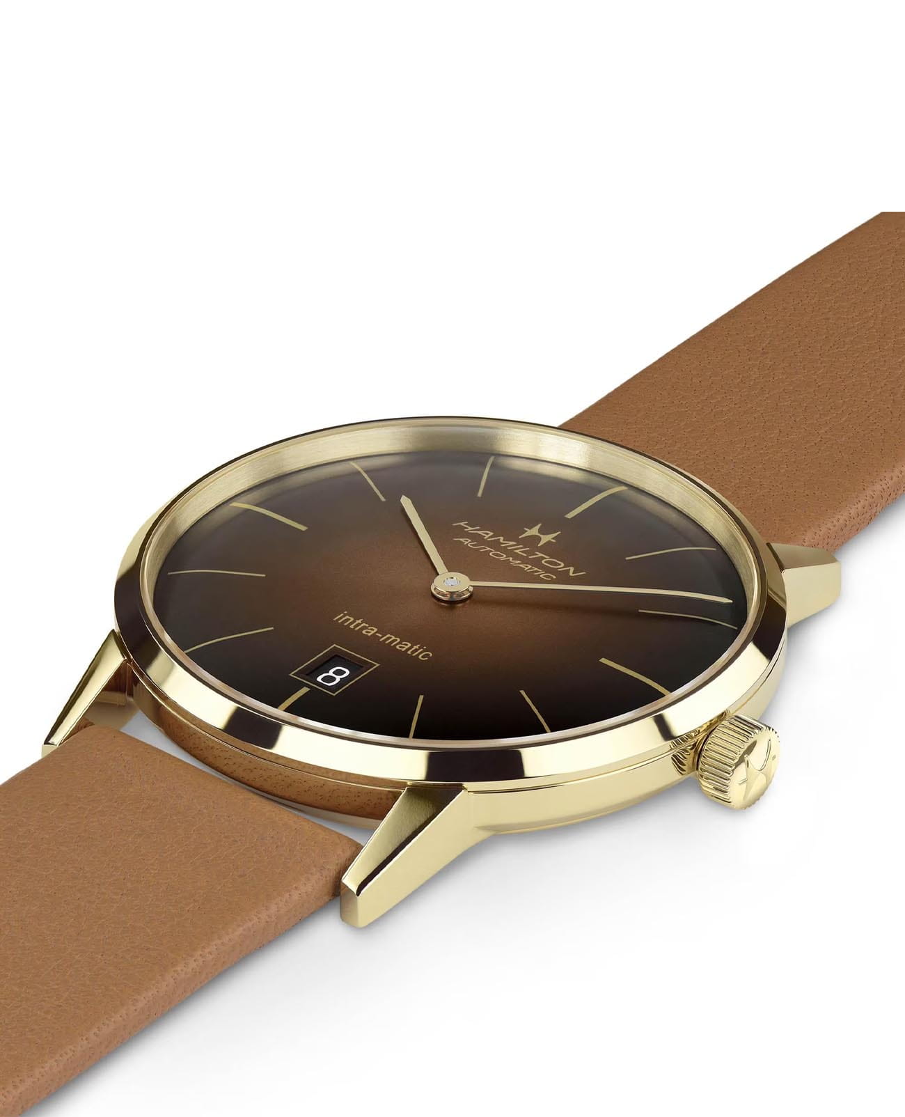 Мужские наручные часы Hamilton American Classic Intra-Matic Auto H38475501 с надёжным автоматическим механизмом. Корпус часов изготовлен из нержавеющей стали с золотым PVD-покрытиемPVDУльтратонкое покрытие наносится в технике вакуумного напыления, сочетает в себе нитрид титана особой прочности со слоем золота или оксида хрома. Несёт в себе декоративную или защитную функцию.. Практичный кожаный ремешок на стандартной застёжке. Сапфировое стеклоСапфировое стеклоПрочный и надёжный материал из кристалла сапфира синтетического происхождения, характеризующийся особой твёрдостью и устойчивостью к царапинам и повреждениям. с антибликовым покрытием. Окошко даты находится в положении 6 часов.