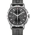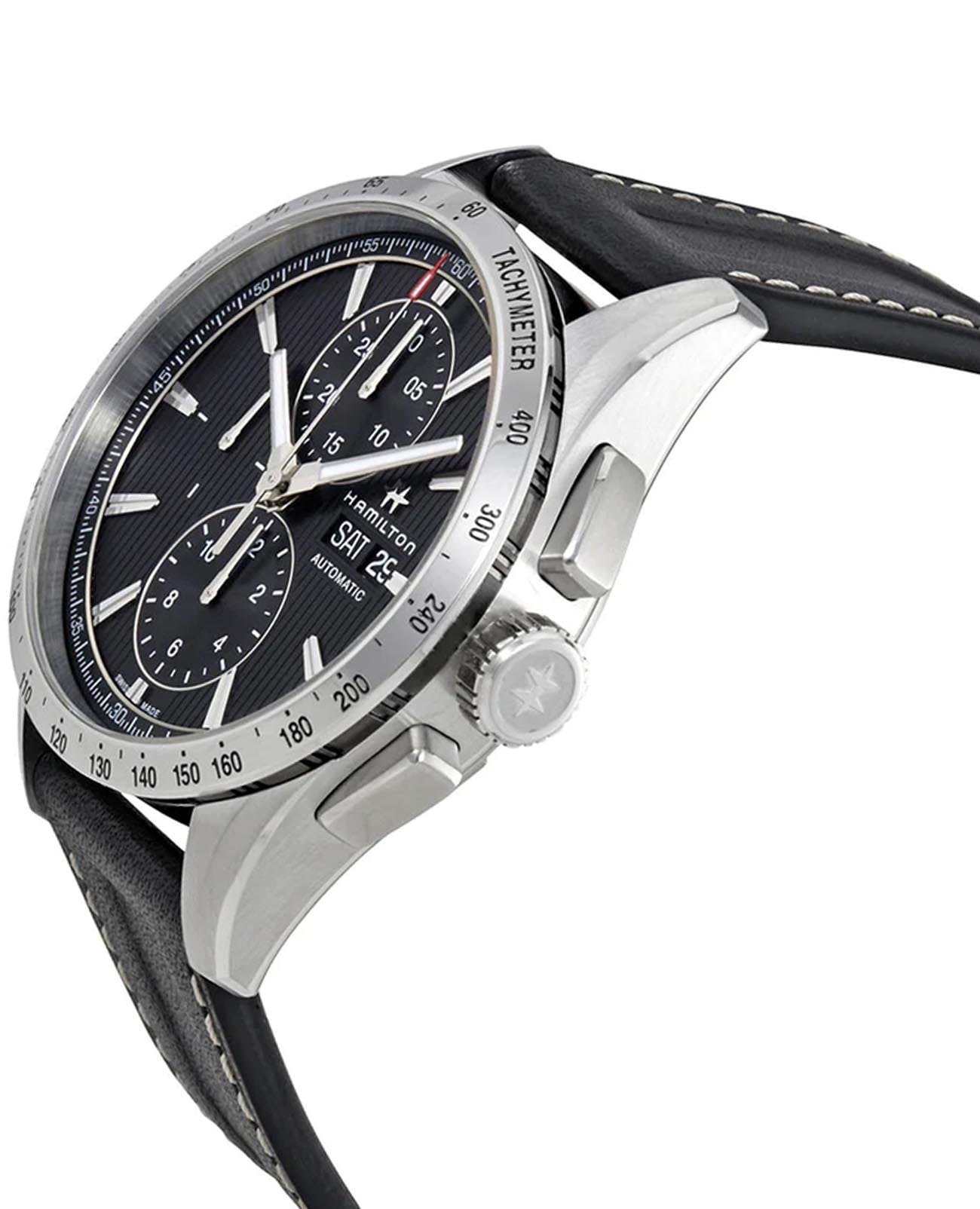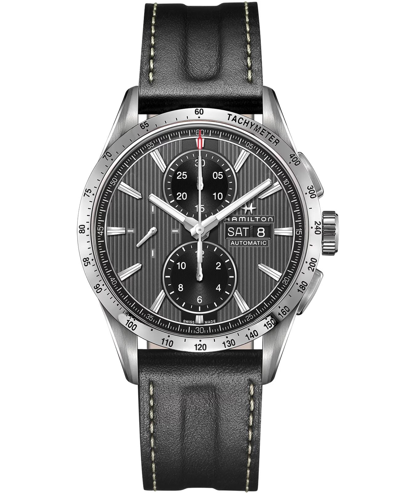 Мужские швейцарские наручные часы-хронографХронографФункция позволяет измерять отрезки времени с особой точностью: часы, минуты, секунды. Верным признаком хронографа является наличие на циферблате 3 дополнительных окошек-счётчиков. Hamilton Broadway Day Date Auto Chrono H43516731 с надёжным кварцевым механизмом. Корпус часов изготовлен из нержавеющей стали. Кожаный ремешок с раскладной застёжкойРаскладная застёжкаТакой тип застёжки используется только на браслетах из металла. Она никогда не раскрывается полностью, происходит разделение на 2 и более частей. Раскладывающая застёжка снизит вероятность потери часов к минимуму.. Сапфировое стеклоСапфировое стеклоПрочный и надёжный материал из кристалла сапфира синтетического происхождения, характеризующийся особой твёрдостью и устойчивостью к царапинам и повреждениям. устойчивое к мелким механическим повреждениям. Стрелки и метки с люминесцентным покрытиемЛюминесцентное покрытиеПозволяет считывать показания времени в темноте. Производители наносят на стрелки, часовые индексы, безель или поверхность циферблата светонакопительный состав, дающий холодное свечение.. Окошки дня недели и даты находятся в положении 3 часа. Класс водозащиты: 100 метров, позволит плавать, нырять и заниматься другими водными видами спорта. БезельБезельВнешний ободок, закрепляющий стекло. В спортивных часах так называется поворотное кольцо с делениями на циферблате, выполняет роль таймера – замеряет отрезки времени на шкале. Неподвижный безель – элемент декора. Однонаправленно вращающийся безель на дайверских часах позволяет фиксировать моменты погружения и выныривания на поверхность. со шкалой тахиметраТахиметрРазмеченная шкала, располагается на ободке или безеле часов. Тахиметр позволяет рассчитать скорость на определённом участке пути, расстояние измеряется в километрах или милях..