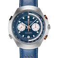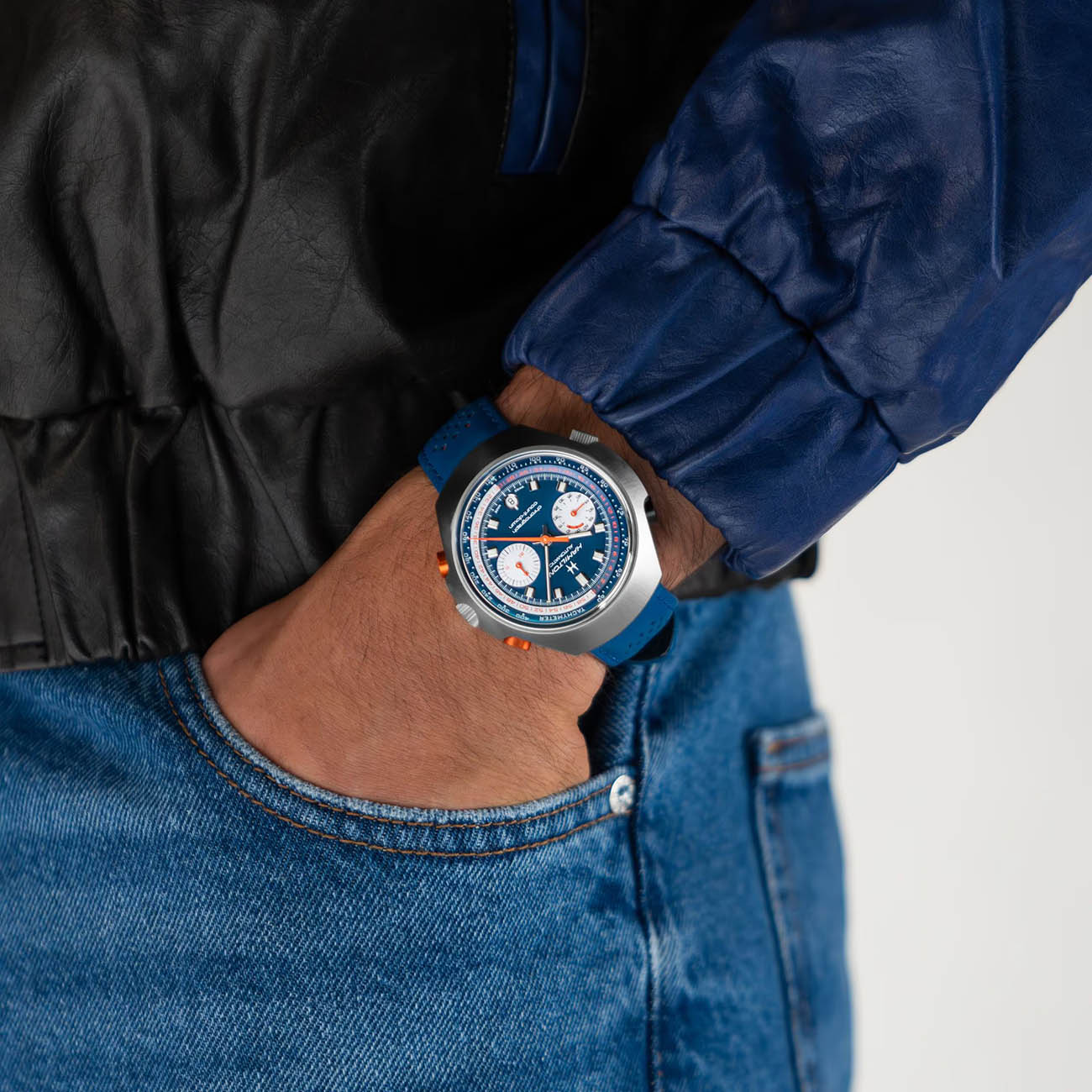 Часы Hamilton American Classic Chrono-Matic 50 (модель H51606640) — лимитированная серия из 150 экземпляров, вдохновленная гоночным духом 1970-х годов и переосмысляющая легендарную модель Chrono-Matic E. Выразительный 48-мм корпус из нержавеющей стали сочетается с контрастной сине-оранжевой палитрой циферблата. Модель оснащена автоматическим калибром H-31 с 60-часовым запасом хода. Ключевые функции включают хронографХронографФункция позволяет измерять отрезки времени с особой точностью: часы, минуты, секунды. Верным признаком хронографа является наличие на циферблате 3 дополнительных окошек-счётчиков., тахиметрическую шкалу на безелеБезельВнешний ободок, закрепляющий стекло. В спортивных часах так называется поворотное кольцо с делениями на циферблате, выполняет роль таймера – замеряет отрезки времени на шкале. Неподвижный безель – элемент декора. Однонаправленно вращающийся безель на дайверских часах позволяет фиксировать моменты погружения и выныривания на поверхность. и окошко даты. Ударопрочное сапфировое стеклоСапфировое стеклоПрочный и надёжный материал из кристалла сапфира синтетического происхождения, характеризующийся особой твёрдостью и устойчивостью к царапинам и повреждениям. с антибликовым покрытиемАнтибликовое покрытиеСлой оксида металла в 0,13-0,3 микрон, благодаря которому стекло часов не бликует и не отражает свет. Антибликовое покрытие уменьшает отражение света в 10 раз, обеспечивая отличную читаемость показателей циферблата. гарантирует защиту от царапин, а спираль баланса Nivachron™Nivachron™Специально разработанный инновационный сплав Nivachron™ повышает устойчивость часов к воздействию магнитных полей. обеспечивает устойчивость к магнитным полям и перепадам температур. Люминесцентное покрытиеЛюминесцентное покрытиеПозволяет считывать показания времени в темноте. Производители наносят на стрелки, часовые индексы, безель или поверхность циферблата светонакопительный состав, дающий холодное свечение. Super-LumiNova на стрелках и индексах обеспечивает видимость в темноте. Водонепроницаемость 10 бар (100 метров) позволяет использовать часы при плавании. Ремешок из перфорированной кожи коровы в двухцветном сине-оранжевом исполнении дополнен классической застёжкой шириной 20 мм.
