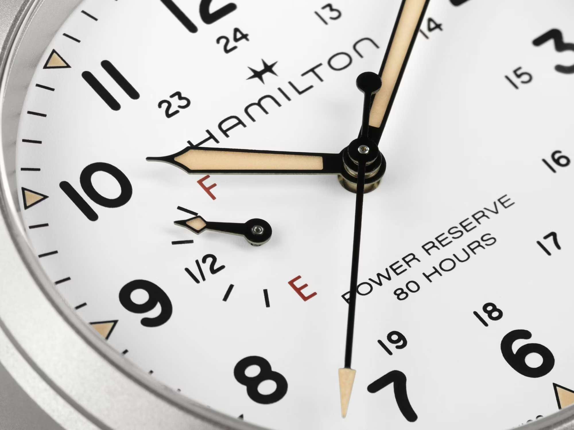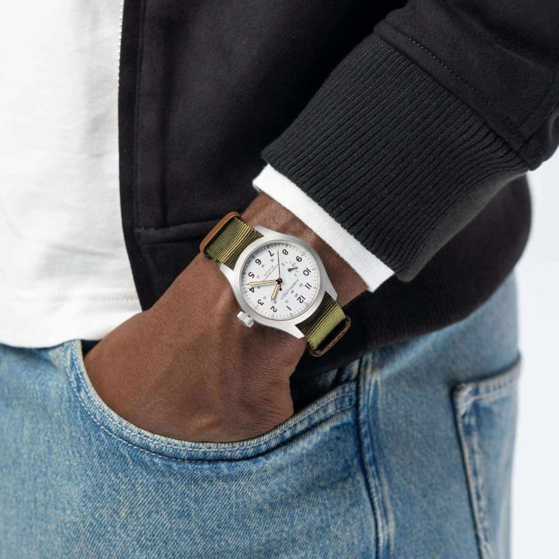 Мужские наручные часы Hamilton Khaki Field Mechanical Power Reserve 40mm H69509910 сочетают в себе спортивный стиль и элегантный дизайн. Модель обладает круглым корпусом диаметром 40 мм, изготовленным из нержавеющей стали, что обеспечивает высокую устойчивость к внешним воздействиям. Изысканный ремешок выполнен из ткани со стандартной застежкой, гарантирующей комфортное ношение и безопасность. Лаконичный циферблат оснащен крупными цифрами и стрелками с люминесцентным покрытиемЛюминесцентное покрытиеПозволяет считывать показания времени в темноте. Производители наносят на стрелки, часовые индексы, безель или поверхность циферблата светонакопительный состав, дающий холодное свечение. Super-LumiNova®, обеспечивающим превосходную видимость в темноте. Для защиты используется сапфировое стеклоСапфировое стеклоПрочный и надёжный материал из кристалла сапфира синтетического происхождения, характеризующийся особой твёрдостью и устойчивостью к царапинам и повреждениям., которое эффективно противостоит царапинам и имеет антибликовое покрытиеАнтибликовое покрытиеСлой оксида металла в 0,13-0,3 микрон, благодаря которому стекло часов не бликует и не отражает свет. Антибликовое покрытие уменьшает отражение света в 10 раз, обеспечивая отличную читаемость показателей циферблата.. Часы работают с помощью механизма H-23.  Механизм с пружиной баланса Nivachron™Nivachron™Специально разработанный инновационный сплав Nivachron™ повышает устойчивость часов к воздействию магнитных полей. гарантирует точность хода, устойчивость к магнитным полям. На циферблате также буквы «F» для обозначения полного заряда и «E» для обозначения пустого заряда, что подчеркивает эту исключительную и практичную функцию. Водонепроницаемость часов достигает 10 атмосфер (100 метров), делающая их подходящими для повседневного использования и активного отдыха. Это сочетание высокой прочности, точности и изысканного дизайна для уверенных в себе мужчин.