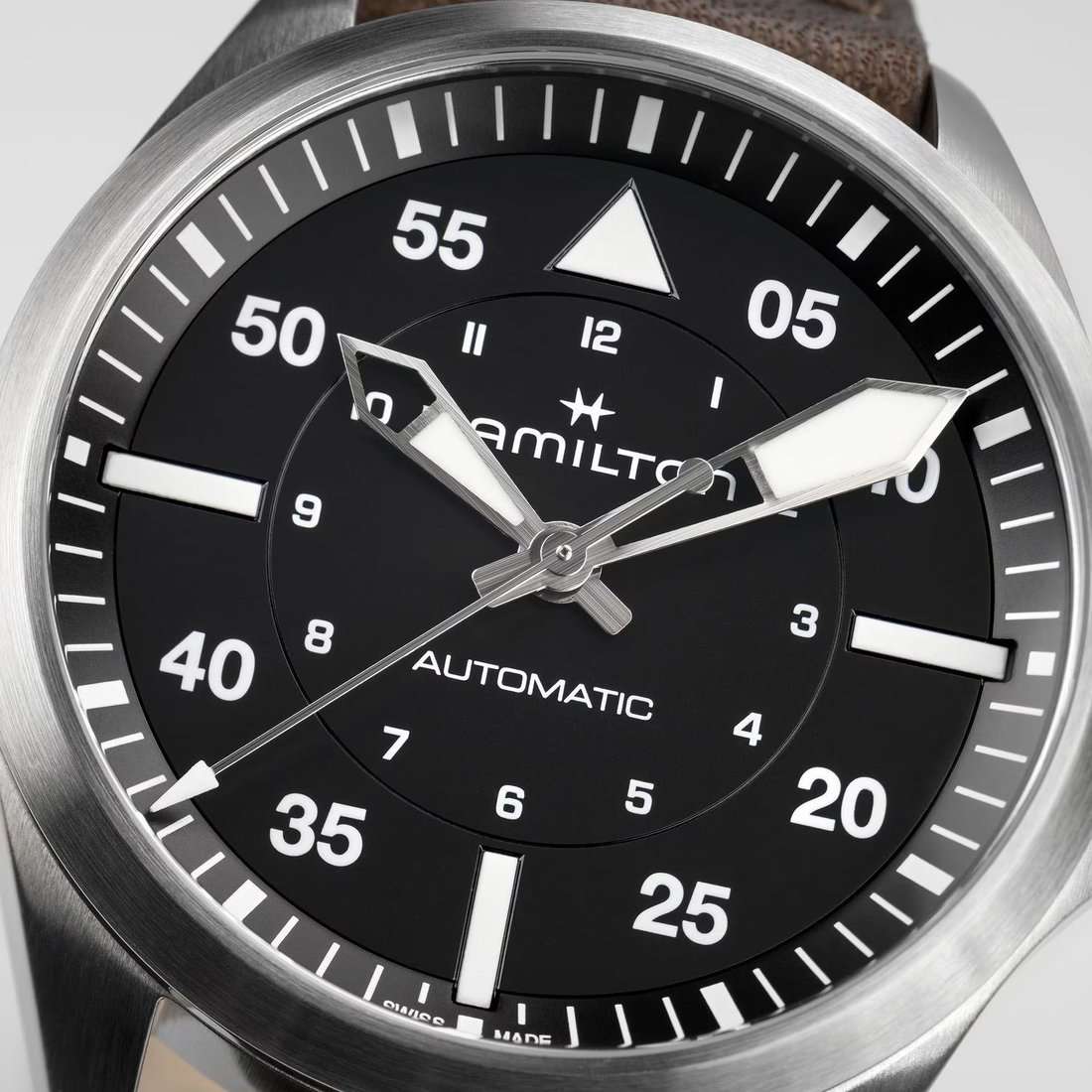 Hamilton Khaki Aviation Pilot Auto H76305530 — классические пилотские часы с современным наполнением и выразительным авиационным стилем. Корпус диаметром 39 мм выполнен из сатинированной нержавеющей стали, а прозрачная задняя крышка позволяет наблюдать за работой механизма. Чёрный матовый циферблат оформлен в духе приборной панели самолёта: крупная минутная разметка вынесена на внешний круг, а внутренняя шкала обозначает часы. Стрелки и метки покрыты люминесцентным покрытиемЛюминесцентное покрытиеПозволяет считывать показания времени в темноте. Производители наносят на стрелки, часовые индексы, безель или поверхность циферблата светонакопительный состав, дающий холодное свечение. Super-LumiNova® для отличной читаемости в любое время суток. Циферблат защищён сапфировым стекломСапфировое стеклоПрочный и надёжный материал из кристалла сапфира синтетического происхождения, характеризующийся особой твёрдостью и устойчивостью к царапинам и повреждениям. с антибликовым покрытиемАнтибликовое покрытиеСлой оксида металла в 0,13-0,3 микрон, благодаря которому стекло часов не бликует и не отражает свет. Антибликовое покрытие уменьшает отражение света в 10 раз, обеспечивая отличную читаемость показателей циферблата.. Механизм — автоматический H-10 с увеличенным запасом хода до 80 часов. Применение сплава Nivachron™Nivachron™Специально разработанный инновационный сплав Nivachron™ повышает устойчивость часов к воздействию магнитных полей. в пружине баланса обеспечивает устойчивость к магнитным полям. Модель укомплектована коричневым кожаным ремешком с фирменным тиснением и классической застёжкой с фиксатором. Водонепроницаемость 100 метров делает эту модель универсальной для ежедневного использования и активного образа жизни.