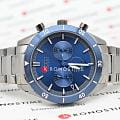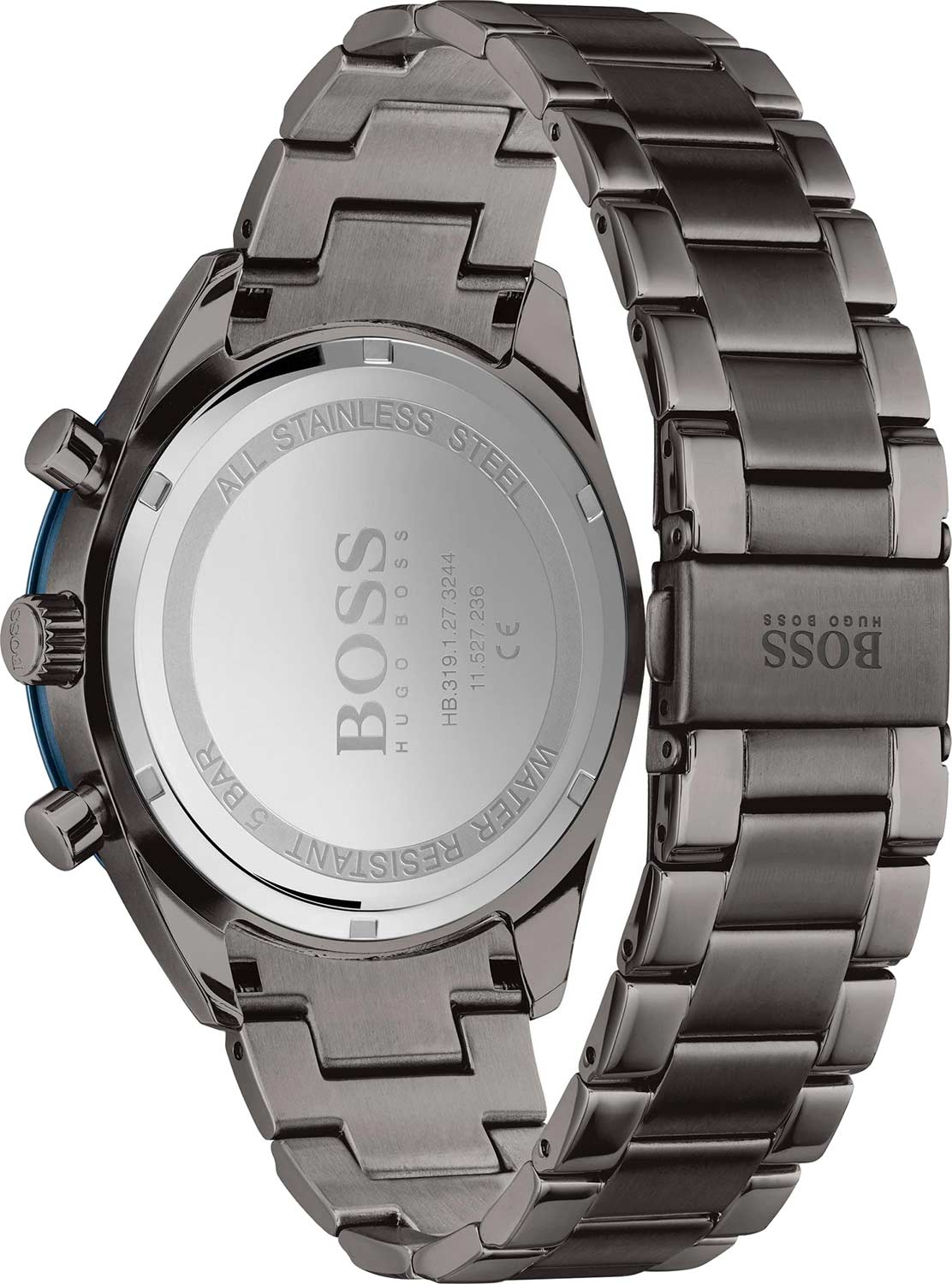 Мужские часы Hugo Boss HB1513863 коллекции Santiago представлены в круглом 44-мм корпусе из нержавеющей стали 316L с IP-покрытиемIP-покрытиеМетод ионного напыления. Демонстрирует повышенную устойчивость к истиранию, окислению и химическим веществам. Под воздействием высокого давления и температуры около 1500°C молекулы металла надёжно соединяются с частицами корпуса часов.. Оснащены кварцевым механизмом с функциями хронографаХронографФункция позволяет измерять отрезки времени с особой точностью: часы, минуты, секунды. Верным признаком хронографа является наличие на циферблате 3 дополнительных окошек-счётчиков., секундомеромСекундомерСекундоме́р — прибор, способный измерять интервалы времени с точностью до долей секунды. и тахиметрической шкалойТахиметрРазмеченная шкала, располагается на ободке или безеле часов. Тахиметр позволяет рассчитать скорость на определённом участке пути, расстояние измеряется в километрах или милях., а также индикацией даты. Синий циферблат с метками в виде штрихов защищен устойчивым к царапинам минеральным стекломМинеральное стеклоМинеральное стекло представляет собой искусственно выращенный минерал кварца. Такое стекло отличается особой устойчивостью к повреждениям и царапинам. Уступает по некоторым качествам сапфировому стеклу.. Стальной браслет с IP-покрытиемIP-покрытиеМетод ионного напыления. Демонстрирует повышенную устойчивость к истиранию, окислению и химическим веществам. Под воздействием высокого давления и температуры около 1500°C молекулы металла надёжно соединяются с частицами корпуса часов. дополнен раскладной застёжкойРаскладная застёжкаТакой тип застёжки используется только на браслетах из металла. Она никогда не раскрывается полностью, происходит разделение на 2 и более частей. Раскладывающая застёжка снизит вероятность потери часов к минимуму.. Водонепроницаемость 50 метров (5 ATM) обеспечивает защиту от брызг и дождя.