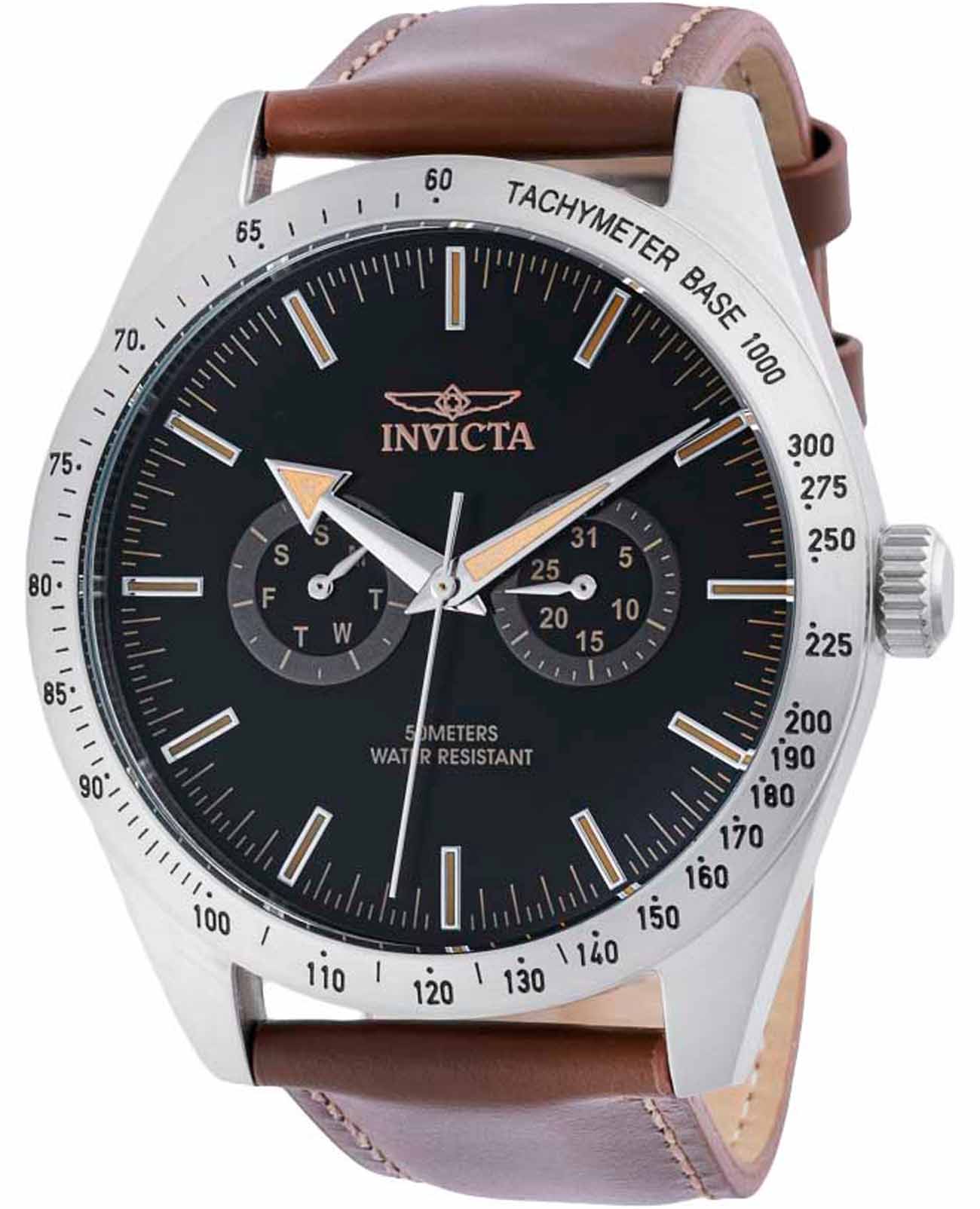 Мужские наручные часы Invicta Specialty IN45973 из коллекции Specialty сочетают в себе спортивный дизайн и надежность современных технологий. Модель обладает круглым корпусом диаметром 44 мм, выполненным из нержавеющей стали, что обеспечивает высокую устойчивость к внешним воздействиям. БезельБезельВнешний ободок, закрепляющий стекло. В спортивных часах так называется поворотное кольцо с делениями на циферблате, выполняет роль таймера – замеряет отрезки времени на шкале. Неподвижный безель – элемент декора. Однонаправленно вращающийся безель на дайверских часах позволяет фиксировать моменты погружения и выныривания на поверхность. украшен тахиметрической шкалой, придающей часам дополнительную элегантность. Кожаный ремешок на стандартной застежке, гарантирует комфортное ношение и безопасность. Черный циферблат дополнен метками в виде штрихов и светящимися стрелками с люминесцентным покрытиемЛюминесцентное покрытиеПозволяет считывать показания времени в темноте. Производители наносят на стрелки, часовые индексы, безель или поверхность циферблата светонакопительный состав, дающий холодное свечение. Tritnite, которые обеспечивают отличную видимость даже в темноте . На циферблате также вынесены отдельные окна для даты, дня недели и индикация 12-ти и 24-х часового формата времени . Для защиты используется минеральное стеклоМинеральное стеклоМинеральное стекло представляет собой искусственно выращенный минерал кварца. Такое стекло отличается особой устойчивостью к повреждениям и царапинам. Уступает по некоторым качествам сапфировому стеклу. Flame Fusion, которое обеспечивает прочность и устойчивость к царапинам .  Часы оснащены кварцевым механизмом калибра Seiko TMI VH64, что гарантирует точность хода без необходимости подзаводки . Водонепроницаемость часов достигает 50 метров (5 атмосфер), что позволяет использовать их во время мытья рук или плавания, однако не рекомендуется для глубоководного дайвинга . Сочетание практичности, надежности и стильного дизайна делает эту модель универсальным аксессуаром как для повседневной носки, так и для занятий спортом .