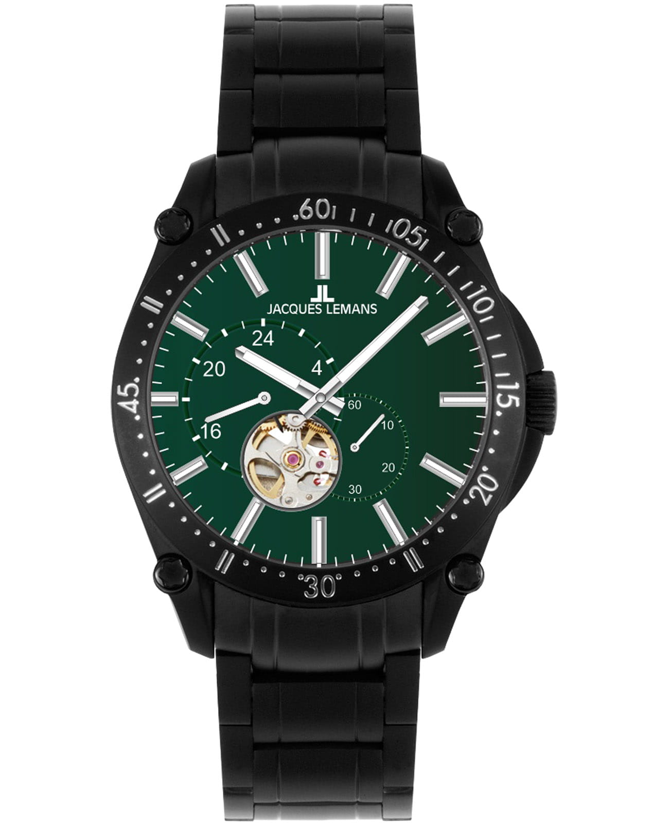 Мужские механические часы-скелетоны Jacques Lemans 1-2201H – лаконичная красота и изысканная элегантность. Оригинальная модель с классическим оформлением станет превосходным завершением образа, наделив его индивидуальным характером. Корпус выполнен из нержавеющей стали с PVD-покрытиемPVDУльтратонкое покрытие наносится в технике вакуумного напыления, сочетает в себе нитрид титана особой прочности со слоем золота или оксида хрома. Несёт в себе декоративную или защитную функцию. черного цвета, диаметром 44 мм, что обеспечивает долговечность и утончённый внешний вид. Минеральное стеклоМинеральное стеклоМинеральное стекло представляет собой искусственно выращенный минерал кварца. Такое стекло отличается особой устойчивостью к повреждениям и царапинам. Уступает по некоторым качествам сапфировому стеклу. с сапфировым напылением защищает циферблат от царапин. Стальной браслет с PVD-покрытиемPVDУльтратонкое покрытие наносится в технике вакуумного напыления, сочетает в себе нитрид титана особой прочности со слоем золота или оксида хрома. Несёт в себе декоративную или защитную функцию. на раскладной застёжкеРаскладная застёжкаТакой тип застёжки используется только на браслетах из металла. Она никогда не раскрывается полностью, происходит разделение на 2 и более частей. Раскладывающая застёжка снизит вероятность потери часов к минимуму. обеспечивает комфортное ношение. Водозащита 100 метров позволит плавать, нырять и заниматься другими водными видами спорта. Стрелки и метки с люминесцентным покрытиемЛюминесцентное покрытиеПозволяет считывать показания времени в темноте. Производители наносят на стрелки, часовые индексы, безель или поверхность циферблата светонакопительный состав, дающий холодное свечение. позволяющие легко определять время даже в темноте. БезельБезельВнешний ободок, закрепляющий стекло. В спортивных часах так называется поворотное кольцо с делениями на циферблате, выполняет роль таймера – замеряет отрезки времени на шкале. Неподвижный безель – элемент декора. Однонаправленно вращающийся безель на дайверских часах позволяет фиксировать моменты погружения и выныривания на поверхность. дополнен минутной шкалой. Запас хода 42 ч. На отдельные циферблаты вынесены индикатор 24-х часов и малая секундная стрелка. Сквозь прозрачное окошко можно наблюдать за работой механизма часов. Рифленая заводная головка с защитой. Это аксессуар для мужчины, который ценит классический стиль и функциональность.