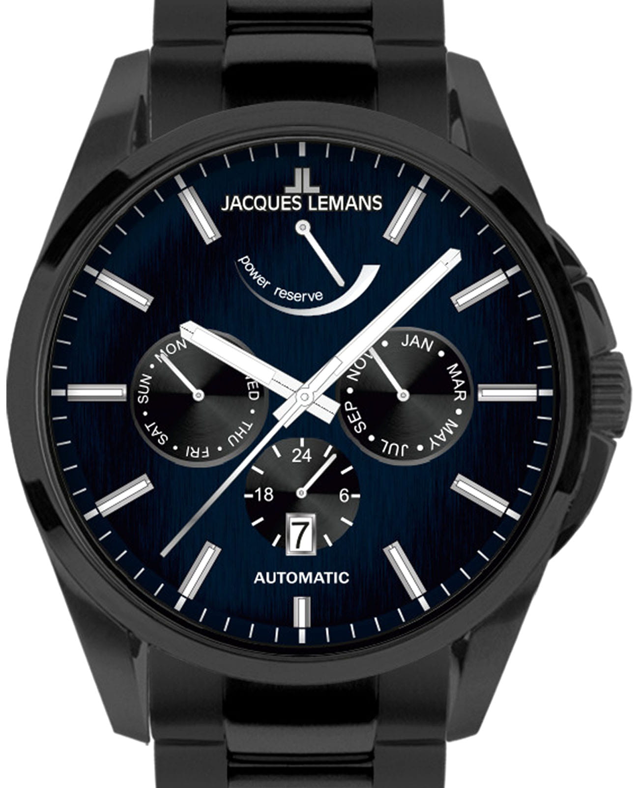 Мужские механические часы с автоподзаводом Jacques Lemans 1-2204D – лаконичная красота и изысканная элегантность. Оригинальная модель с классическим оформлением станет превосходным завершением образа, наделив его индивидуальным характером. Корпус выполнен из нержавеющей стали с PVD-покрытиемPVDУльтратонкое покрытие наносится в технике вакуумного напыления, сочетает в себе нитрид титана особой прочности со слоем золота или оксида хрома. Несёт в себе декоративную или защитную функцию. черного цвета, диаметром 44 мм, что обеспечивает долговечность и утончённый внешний вид. Минеральное стеклоМинеральное стеклоМинеральное стекло представляет собой искусственно выращенный минерал кварца. Такое стекло отличается особой устойчивостью к повреждениям и царапинам. Уступает по некоторым качествам сапфировому стеклу. с сапфировым напылением защищает циферблат от царапин. Стальной браслет на раскладной застёжкеРаскладная застёжкаТакой тип застёжки используется только на браслетах из металла. Она никогда не раскрывается полностью, происходит разделение на 2 и более частей. Раскладывающая застёжка снизит вероятность потери часов к минимуму. обеспечивает комфортное ношение. Водозащита 100 метров позволит плавать, нырять и заниматься другими водными видами спорта. Стрелки и метки с люминесцентным покрытиемЛюминесцентное покрытиеПозволяет считывать показания времени в темноте. Производители наносят на стрелки, часовые индексы, безель или поверхность циферблата светонакопительный состав, дающий холодное свечение. позволяющие легко определять время даже в темноте. Окошко даты находится в положении 6 часов. Индикатор 24-х часов, календарь недели и месяцев вынесены на отдельные циферблаты. Индикация запаса хода в положении 12 часов. Рифленая заводная головка с защитой. Это аксессуар для мужчины, который ценит классический стиль и функциональность.