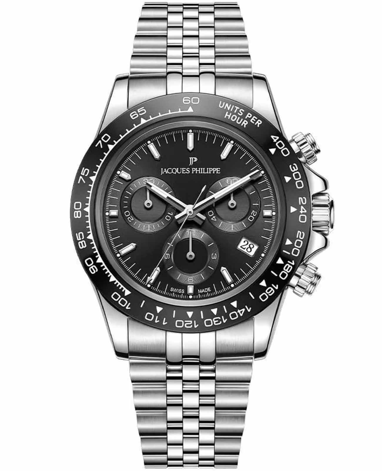 Швейцарские наручные часы Jacques Philippe JPQGC711316SBB сочетают в себе современный дизайн, надежность и функциональность, это стильные швейцарские часы с функцией хронографаХронографФункция позволяет измерять отрезки времени с особой точностью: часы, минуты, секунды. Верным признаком хронографа является наличие на циферблате 3 дополнительных окошек-счётчиков. и секундомераСекундомерСекундоме́р — прибор, способный измерять интервалы времени с точностью до долей секунды.. Корпус круглой формы диаметром 39 мм выполнен из прочной нержавеющей стали, а безельБезельВнешний ободок, закрепляющий стекло. В спортивных часах так называется поворотное кольцо с делениями на циферблате, выполняет роль таймера – замеряет отрезки времени на шкале. Неподвижный безель – элемент декора. Однонаправленно вращающийся безель на дайверских часах позволяет фиксировать моменты погружения и выныривания на поверхность. с элегантным черным IP-покрытиемIP-покрытиеМетод ионного напыления. Демонстрирует повышенную устойчивость к истиранию, окислению и химическим веществам. Под воздействием высокого давления и температуры около 1500°C молекулы металла надёжно соединяются с частицами корпуса часов., а сапфировое стеклоСапфировое стеклоПрочный и надёжный материал из кристалла сапфира синтетического происхождения, характеризующийся особой твёрдостью и устойчивостью к царапинам и повреждениям. надежно защищает черный циферблат от царапин и повреждений. Модель оснащена точным кварцевым механизмом RONDA 5030.D-4H, а также дополнительными функциями — тахиметромТахиметрРазмеченная шкала, располагается на ободке или безеле часов. Тахиметр позволяет рассчитать скорость на определённом участке пути, расстояние измеряется в километрах или милях. и индикатором даты, что делает часы не только стильным аксессуаром, но и практичным помощником на каждый день. Серебристый браслет шириной 20 мм удобно фиксируется на запястье с помощью застежки «бабочка»Застёжка "бабочка"Такой вид застёжки дополняется предохранителями, помогающими избежать случайного раскрытия браслета. Обладают изящным исполнением. . Стрелки имеют люминесцентное покрытиеЛюминесцентное покрытиеПозволяет считывать показания времени в темноте. Производители наносят на стрелки, часовые индексы, безель или поверхность циферблата светонакопительный состав, дающий холодное свечение. для удобства чтения времени в темноте. Водозащита 5 АТМ позволяет не снимать часы при дожде и случайных контактах с водой.