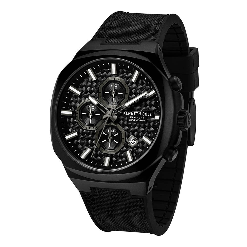 Мужские кварцевые часы Kenneth Cole KCWGO0059603 — это стильный и функциональный аксессуар с современным дизайном. Корпус размером 43 мм выполнен из нержавеющей стали с IP-покрытиемIP-покрытиеМетод ионного напыления. Демонстрирует повышенную устойчивость к истиранию, окислению и химическим веществам. Под воздействием высокого давления и температуры около 1500°C молекулы металла надёжно соединяются с частицами корпуса часов. чёрного цвета, придающим модели спортивный характер. Циферблат чёрного цвета оформлен метками в виде штрихов и дополнен функциями хронографаХронографФункция позволяет измерять отрезки времени с особой точностью: часы, минуты, секунды. Верным признаком хронографа является наличие на циферблате 3 дополнительных окошек-счётчиков. и индикации даты. Стрелки и метки оснащены люминесцентным покрытиемЛюминесцентное покрытиеПозволяет считывать показания времени в темноте. Производители наносят на стрелки, часовые индексы, безель или поверхность циферблата светонакопительный состав, дающий холодное свечение., обеспечивающим хорошую читаемость в темноте. Циферблат защищён минеральным стекломМинеральное стеклоМинеральное стекло представляет собой искусственно выращенный минерал кварца. Такое стекло отличается особой устойчивостью к повреждениям и царапинам. Уступает по некоторым качествам сапфировому стеклу.. Часы оснащены комбинированным ремешком из силикона и нейлона чёрного цвета с классической пряжкой. Водонепроницаемость 50 м позволяет использовать часы для плавания и повседневного ношения. Надёжный выбор для тех, кто ценит выносливость, стиль и функциональность.