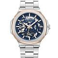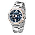 Мужские механические часы с автоподзаводом Kenneth Cole KCWGY0046201 — это выразительный аксессуар, сочетающий современный дизайн и инженерную изысканность. Корпус размером 44 мм выполнен из нержавеющей стали. Безель с частичным IP-покрытиемIP-покрытиеМетод ионного напыления. Демонстрирует повышенную устойчивость к истиранию, окислению и химическим веществам. Под воздействием высокого давления и температуры около 1500°C молекулы металла надёжно соединяются с частицами корпуса часов. розового золота и стального цвета. Циферблат синего цвета частично скелетонизирован, что позволяет наблюдать за работой механизма, добавляя модели динамики и технологичности. Циферблат защищён минеральным стекломМинеральное стеклоМинеральное стекло представляет собой искусственно выращенный минерал кварца. Такое стекло отличается особой устойчивостью к повреждениям и царапинам. Уступает по некоторым качествам сапфировому стеклу. и оформлен метками в виде штрихов. Стрелки и метки оснащены люминесцентным покрытиемЛюминесцентное покрытиеПозволяет считывать показания времени в темноте. Производители наносят на стрелки, часовые индексы, безель или поверхность циферблата светонакопительный состав, дающий холодное свечение., обеспечивающим хорошую читаемость в темноте. Часы оснащены стальным браслетом с раскладной застёжкойРаскладная застёжкаТакой тип застёжки используется только на браслетах из металла. Она никогда не раскрывается полностью, происходит разделение на 2 и более частей. Раскладывающая застёжка снизит вероятность потери часов к минимуму.. Водонепроницаемость 30 м позволяет использовать часы в повседневных условиях, защищая от случайных брызг и капель дождя. Сочетание строгого стиля и детального исполнения делает эти часы заметным элементом образа.