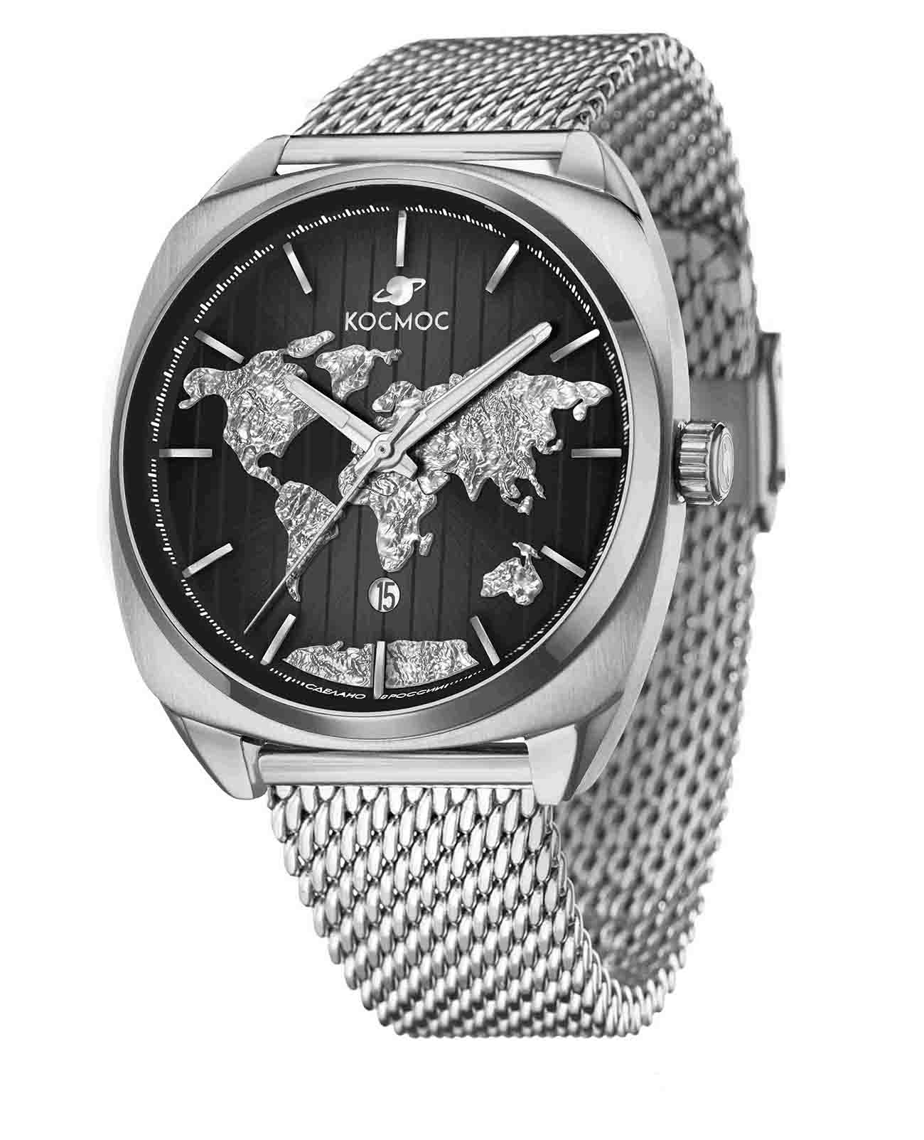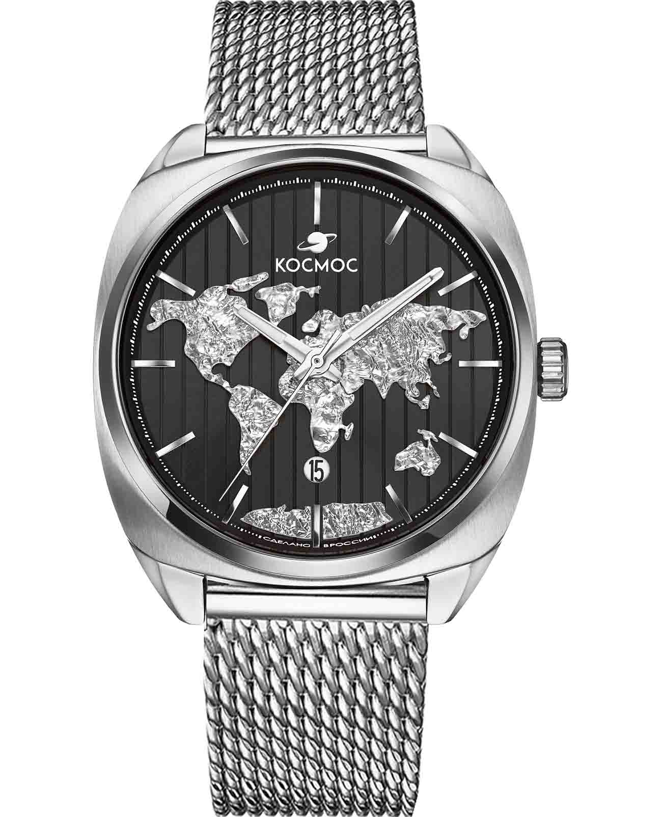 Российские мужские механические часы Космос из коллекции ЦУП с автоподзаводом оснащены надежным механизмом TMI. Корпус из нержавеющей стали шириной 44 мм и шириной выступа 22 мм защищен прочным минеральным стекломМинеральное стеклоМинеральное стекло представляет собой искусственно выращенный минерал кварца. Такое стекло отличается особой устойчивостью к повреждениям и царапинам. Уступает по некоторым качествам сапфировому стеклу.. Модель имеет класс водозащиты 100 метров, позволит плавать, и заниматься другими водными видами спорта. Черный циферблат с индексами дополнен функцией отображения даты. Часы комплектуются браслетом из нержавеющей стали с миланским плетением на раскладном замкеРаскладной замокДанный вариант застежки используется только на часах с металлическим браслетом. Отличительная особенность такого крепления в том, что длина браслета становится универсальной и вы можете самостоятельно отрегулировать нужный вам размер – застежка просто двигается по браслету часов.. Классический дизайн и надежный механизм делают эти часы превосходным выбором для современного мужчины, ценящего стиль и функциональность. Серебристый цвет корпуса подчеркивает элегантность модели.