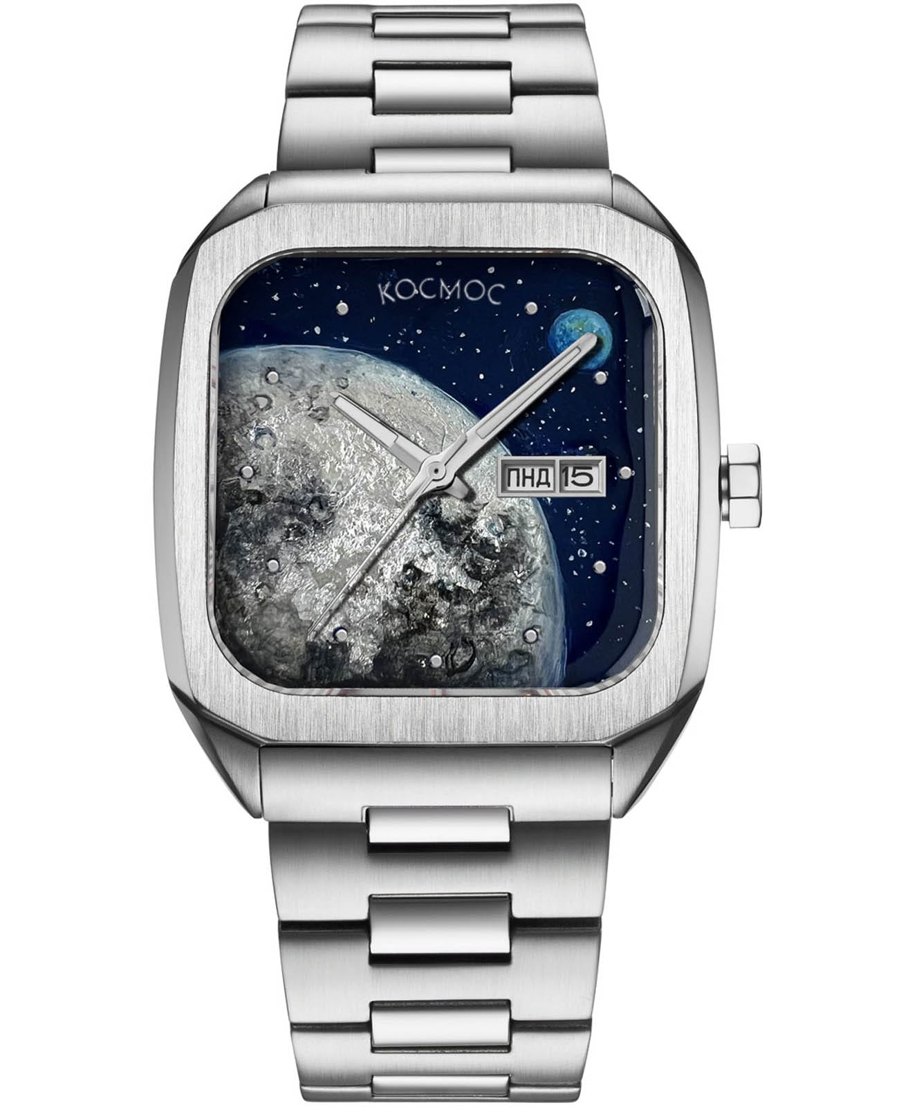 Мужские наручные часы Космос К 213.10 - Восход на Луне — это уникальная модель. Вы когда-нибудь задумывались, как выглядит восход Земли с точки зрения находящегося на Луне? Современные космические аппараты позволяют каждому увидеть это явление в записи, а мастера бренда Космос воссоздали восход на Луне, используя технику лаковой миниатюры. На основу было нанесено несколько слоев лака и краски - их чередование создает эффект объема и ощущение динамики. Для передачи неоднородности лунного грунта использовали тончайший лист серебряной фольги. Насыщенно-синий цвет фона передает бескрайность космического пространства и служит фоном россыпи ярких звезд. Для создания этой уникальной модели часов мастера бренда выбрали технику лаковой миниатюры. На основу наносится несколько слоев лака и краски, их чередование создает объемный эффект и ощущение движения. Процесс постепенной прорисовки деталей довольно длительный: художнику требуется до 50 часов для завершения одного сюжета. Затем миниатюра запекается в специальной печи, что придаёт рисунку необходимую яркость и завершенность. Эти часы созданы в единственном экземпляре. В часах установлен механизм TMI с функцией автоподзавода. Они показывают часы, минуты и секунды, а также дату и день недели, индикатор которых с накладной рамкой расположен в положении «3 часа». За движением деталей механизма можно наблюдать, стоит только перевернуть часы: задняя крышка прозрачная, закреплена на 4-х винтах. Часовая и минутная стрелки c люминесцентным покрытиемЛюминесцентное покрытиеПозволяет считывать показания времени в темноте. Производители наносят на стрелки, часовые индексы, безель или поверхность циферблата светонакопительный состав, дающий холодное свечение., которое светится в темноте. В модели установлено сапфировое стеклоСапфировое стеклоПрочный и надёжный материал из кристалла сапфира синтетического происхождения, характеризующийся особой твёрдостью и устойчивостью к царапинам и повреждениям. с антибликовым покрытиемАнтибликовое покрытиеСлой оксида металла в 0,13-0,3 микрон, благодаря которому стекло часов не бликует и не отражает свет. Антибликовое покрытие уменьшает отражение света в 10 раз, обеспечивая отличную читаемость показателей циферблата.. Браслет собран из стальных звеньев с полировкой, удобная и надежная застежка-клипса украшена логотипом бренда Космос.