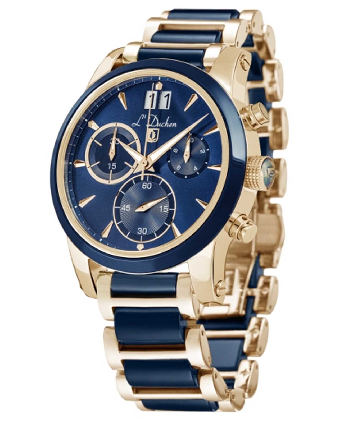 Мужские швейцарские часы-хронографХронографФункция позволяет измерять отрезки времени с особой точностью: часы, минуты, секунды. Верным признаком хронографа является наличие на циферблате 3 дополнительных окошек-счётчиков. L'Duchen Aerostat Chrono D 232.20.36, кварцевый механизм с высокой точностью. Сапфировое стеклоСапфировое стеклоПрочный и надёжный материал из кристалла сапфира синтетического происхождения, характеризующийся особой твёрдостью и устойчивостью к царапинам и повреждениям. устойчивое к появлению царапин, обладающее высокой прозрачностью. Корпус часов выполнен из нержавеющей стали с PVD-покрытиемPVDУльтратонкое покрытие наносится в технике вакуумного напыления, сочетает в себе нитрид титана особой прочности со слоем золота или оксида хрома. Несёт в себе декоративную или защитную функцию.. БезельБезельВнешний ободок, закрепляющий стекло. В спортивных часах так называется поворотное кольцо с делениями на циферблате, выполняет роль таймера – замеряет отрезки времени на шкале. Неподвижный безель – элемент декора. Однонаправленно вращающийся безель на дайверских часах позволяет фиксировать моменты погружения и выныривания на поверхность. из керамики. Стрелки с люминесцентным покрытиемЛюминесцентное покрытиеПозволяет считывать показания времени в темноте. Производители наносят на стрелки, часовые индексы, безель или поверхность циферблата светонакопительный состав, дающий холодное свечение.. Класс водозащиты: 100 метров, позволит плавать, нырять и заниматься другими водными видами спорта. Стальной браслет с PVD-покрытиемPVDУльтратонкое покрытие наносится в технике вакуумного напыления, сочетает в себе нитрид титана особой прочности со слоем золота или оксида хрома. Несёт в себе декоративную или защитную функцию. и керамическими вставками на застёжке «бабочка» с кнопкамиЗастёжка "бабочка"Такой вид застёжки дополняется предохранителями, помогающими избежать случайного раскрытия браслета. Обладают изящным исполнением. .