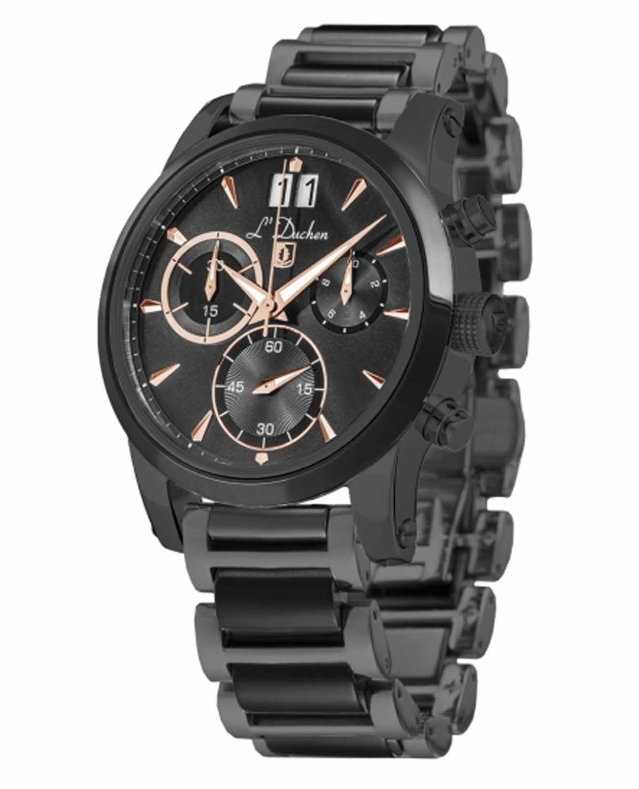 Мужские швейцарские часы-хронографХронографФункция позволяет измерять отрезки времени с особой точностью: часы, минуты, секунды. Верным признаком хронографа является наличие на циферблате 3 дополнительных окошек-счётчиков. L'Duchen Aerostat Chrono D 232.70.35, кварцевый механизм с высокой точностью. Сапфировое стеклоСапфировое стеклоПрочный и надёжный материал из кристалла сапфира синтетического происхождения, характеризующийся особой твёрдостью и устойчивостью к царапинам и повреждениям. устойчивое к появлению царапин, обладающее высокой прозрачностью. Корпус часов выполнен из нержавеющей стали с PVD-покрытиемPVDУльтратонкое покрытие наносится в технике вакуумного напыления, сочетает в себе нитрид титана особой прочности со слоем золота или оксида хрома. Несёт в себе декоративную или защитную функцию.. БезельБезельВнешний ободок, закрепляющий стекло. В спортивных часах так называется поворотное кольцо с делениями на циферблате, выполняет роль таймера – замеряет отрезки времени на шкале. Неподвижный безель – элемент декора. Однонаправленно вращающийся безель на дайверских часах позволяет фиксировать моменты погружения и выныривания на поверхность. из керамики. Стрелки с люминесцентным покрытиемЛюминесцентное покрытиеПозволяет считывать показания времени в темноте. Производители наносят на стрелки, часовые индексы, безель или поверхность циферблата светонакопительный состав, дающий холодное свечение.. Класс водозащиты: 100 метров, позволит плавать, нырять и заниматься другими водными видами спорта. Стальной браслет с PVD-покрытиемPVDУльтратонкое покрытие наносится в технике вакуумного напыления, сочетает в себе нитрид титана особой прочности со слоем золота или оксида хрома. Несёт в себе декоративную или защитную функцию. и керамическими вставками на застёжке «бабочка» с кнопкамиЗастёжка "бабочка"Такой вид застёжки дополняется предохранителями, помогающими избежать случайного раскрытия браслета. Обладают изящным исполнением. .