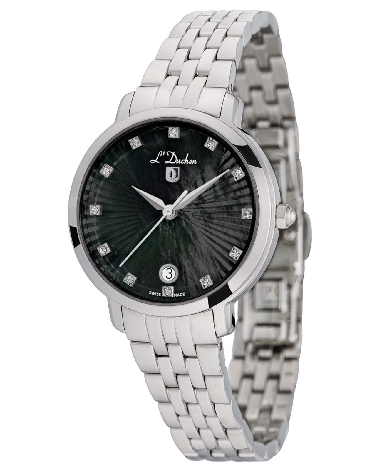 Женские швейцарские часы L'Duchen Eternity D 801.10.31, кварцевый механизм с высокой точностью. Сапфировое стеклоСапфировое стеклоПрочный и надёжный материал из кристалла сапфира синтетического происхождения, характеризующийся особой твёрдостью и устойчивостью к царапинам и повреждениям. устойчивое к появлению царапин, обладающее высокой прозрачностью. Корпус часов выполнен из нержавеющей стали. Окошко даты находится в положении 6 часов. Класс водозащиты: 50 метров, позволит защитить корпус от случайных брызг или капель дождя. Стальной браслет на застёжке «бабочка» с кнопкамиЗастёжка "бабочка"Такой вид застёжки дополняется предохранителями, помогающими избежать случайного раскрытия браслета. Обладают изящным исполнением. .